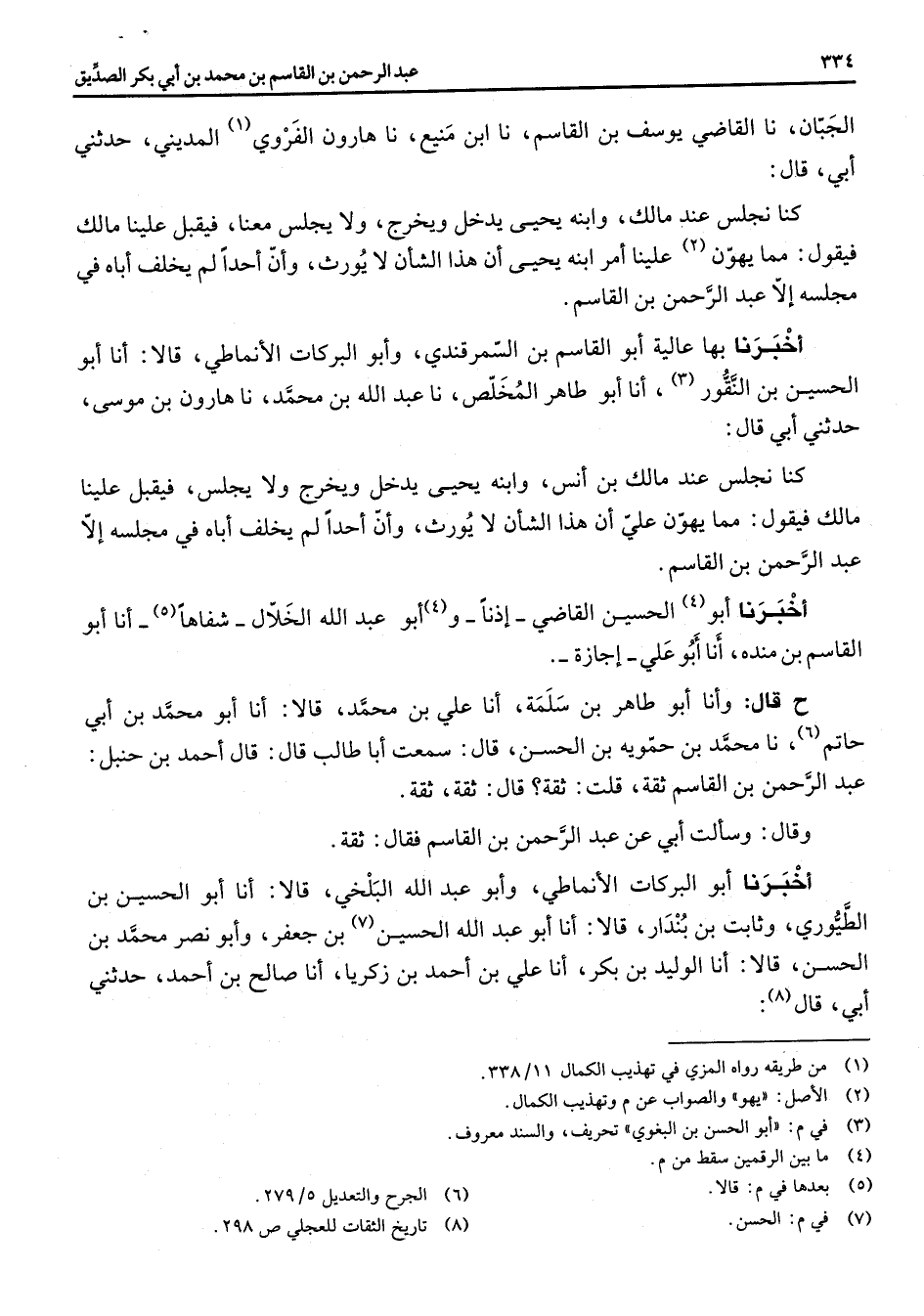 الجبان نا القاضي يوسف بن القاسم نا ابن منيع نا هارون الفروي (1) المديني حدثني أبي قال كنا نجلس عند مالك وابنه يحيى يدخل ويخرج ولا يجلس معنا فيقبل علينا مالك فيقول مما يهون (2) علينا أمر ابنه يحيى ان هذا الشأن لا يورث وان احدا لم يخلف أباه في مجلسه الا عبد الرحمن بن القاسم اخبرنا بها عالية أبو القاسم بن السمرقندي وأبو البركات الأنماطي قالا انا أبو الحسين بن النقور (3) انا أبو طاهر المخلص نا عبد الله بن محمد نا هارون بن موسى حدثني أبي قال كنا نجلس عند مالك بن انس وابنه يحيى يدخل ويخرج ولا يجلس فيقبل علينا مالك فيقول مما يهون علي ان هذا الشأن لا يورث وان احدا لم يخلف اباه في مجلسه الا عبد الرحمن بن القاسم أخبرنا أبو (4) الحسين القاضي اذنا و (4) أبو عبد الله الخلال شفاها (5) انا أبو القاسم بن منده انا أبو علي اجازة ح قال وانا أبو طاهر بن سلمة انا علي بن محمد قالا انا أبو محمد بن ابي حاتم (6) نا محمد بن حمويه بن الحسن قال سمعت أبا طالب قال قال احمد بن حنبل عبد الرحمن بن القاسم ثقة قلت ثقة قال ثقة ثقة وقال سألت أبي عبد الرحمن بن القاسم فقال ثقة أخبرنا أبو البركات الأنماطي وأبو عبد الله البلخي قالا انا أبو الحسين بن الطيوري وثابت بن بندار قالا انا أبو عبد الله الحسين (7) بن جعفر وأبو نصر محمد بن الحسن قالا انا الوليد بن بكر انا علي بن احمد بن زكريا انا صالح بن احمد حدثني أبي قال (8)