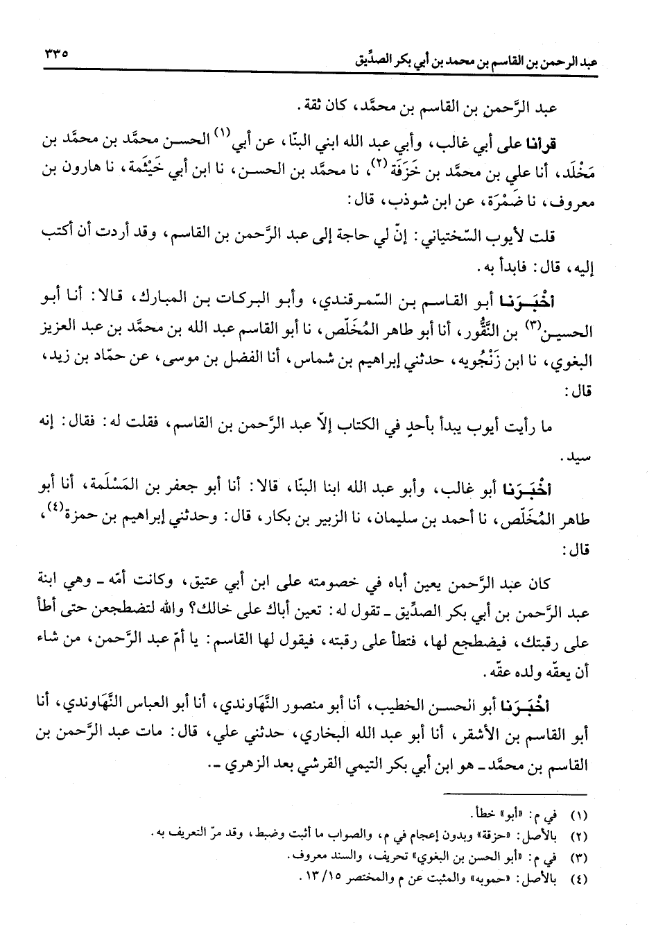 عبد الرحمن بن القاسم بن محمد كان ثقة قرأنا على ابي غالب وأبي عبد الله ابني البنا عن أبي (1) الحسن محمد بن محمد بن مخالد انا علي بن محمد بن خزفة (2) نا محمد بن الحسن نا ابن أبي خيثمة نا هارون بن معروف نا ضمرة عن ابن شوذب قال قلت لأيوب السختياني ان لي حاجة الى عبد الرحمن بن القاسم وقد أردت ان أكتب إليه قال فابدأ به اخبرنا أبو القاسم بن السمرقندي وأبو البركات بن المبارك قالا انا أبو الحسين (3) بن النقور انا أبو طاهر المخلص نا أبو القاسم عبد الله بن محمد بن عبد العزيز البغوي نا ابن زنجويه حدثني ابراهيم بن شماس انا الفضل بن موسى عن حماد بن زيد قال ما رأيت أيوب يبدأ بأحد في الكتاب الا عبد الرحمن بن القاسم فقلت له فقال انه سيد اخبرنا أبو غالب وابو عبد الله ابنا البنا قالا انا أبو جعفر بن المسلمة انا أبو طاهر المخلص نا احمد بن سليمان نا الزبير بن بكار قال وحدثني ابراهيم بن حمزة (4) قال كان عبد الرحمن يعين أباه في خصومته على ابن أبي عتيق وكانت امه وهي ابنة عبد الرحمن بن ابي بكر الصديق تقول له تعين أباك على خالك والله لتضطجعن حتى أطأ على رقبتك فيضطجع لها فتطأ على رقبته فيقول لها القاسم يا أم عبد الرحمن من شاء أن يعقه ولده عقه أخبرنا أبو الحسن الخطيب انا أبو منصور النهاوندي انا أبو العباس النهاوندي أنا أبو القاسم بن الأشقر انا أبو عبد الله البخاري حدثني علي قال مات عبد الرحمن بن القاسم بن محمد هو ابن أبي بكر التيمي القرشي بعد الزهري