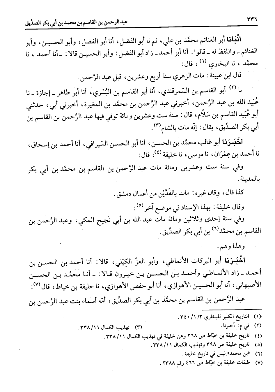 انبأنا أبو الغنائم محمد بن علي ثم نا أبو الفضل انا أبو الفضل وأبو الحسين وأبو الغنائم واللفظ له قالوا أنا أبو أحمد زاد أبو الفضل وأبو الحسين قالا أنا احمد نا محمد نا البخاري (1) قال قال ابن عيينة مات الزهري سنة أربع وعشرين قبل عبد الرحمن نا (2) أبو القاسم بن السمرقندي انا أبو القاسم بن البسري انا أبو طاهر اجازة نا عبيد الله بن عبد الرحمن أخبرني عبد الرحمن بن محمد بن المغيرة أخبرني أبي حدثني أبو عبيد القاسم بن سلام قال سنة ست وعشرين ومائة توفي فيها عبد الرحمن بن القاسم بن أبي بكر الصديق يقال انه مات بالشام (3) أخبرنا أبو غالب محمد بن الحسن انا أبو الحسن السيرافي انا احمد بن اسحاق نا أحمد بن عمران نا موسى نا خليفة (4) قال وفي سنة ست وعشرين ومائة مات عبد الرحمن بن القاسم بن محمد بن أبي بكر بالمدينة كذا قال وقال غيره مات بالفدين من اعمال دمشق وقال خليفة بهذا الاسناد في موضع آخر (5) وفي سنة احدى وثلاثين ومائة مات عبد الله بن أبي نجيح المكي وعبد الرحمن بن القاسم بن محمد (6) بن ابي بكر الصديق وهذا وهم أخبرنا أبو البركات الأنماطي وأبو العز الكيلي قالا انا احمد بن الحسن بن احمد زاد الأنماطي وأحمد بن الحسن بن خيرون قالا انا محمد بن الحسن الأصبهاني انا أبو الحسين الأهوازي انا أبو حفص الأهوازي نا خليفة بن خياط قال (7) عبد الرحمن بن القاسم بن محمد بن ابي بكر الصديق امه أسماء بنت عبد الرحمن بن