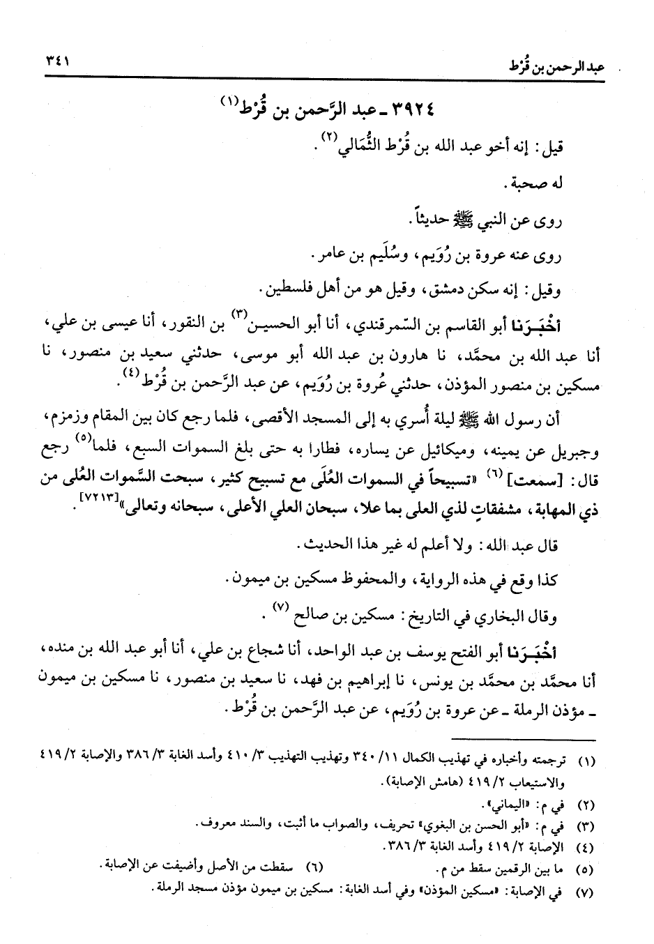 3942 - عبد الرحمن بن قرط (1) قيل انه اخو عبد الله بن قرط الثمالي (2) له صحبة روى عن النبي (صلى الله عليه وسلم) حديثا روى عنه عروة بن رويم وسليم بن عامر وقيل انه سكن دمشق وقيل هو من أهل فلسطين اخبرنا أبو القاسم بن السمرقندي انا أبو الحسين (3) بن النقور انا عيسى بن علي انا عبد الله بن محمد نا هارون بن عبد الله أبو موسى حدثني سعيد بن منصور نا مسكين بن منصور المؤذن حدثني عروة بن رويم عن عبد الرحمن بن قرط (4) ان رسول الله (صلى الله عليه وسلم) ليلة أسري به الى المسجد الأقصى فلما رجع كان بين المقام وزمزم وجبريل عن يمينه وميكائيل عن يساره فطارا به حتى بلغ السموات السبع فلما (5) رجع قال [سمعت] (6) تسبيحا في السموات العلى مع تسبيح كثير سبحت السموات العلى من ذي المهابة مشفقات لذي العلى بما علا سبحان العلي الأعلى سبحانه وتعالى