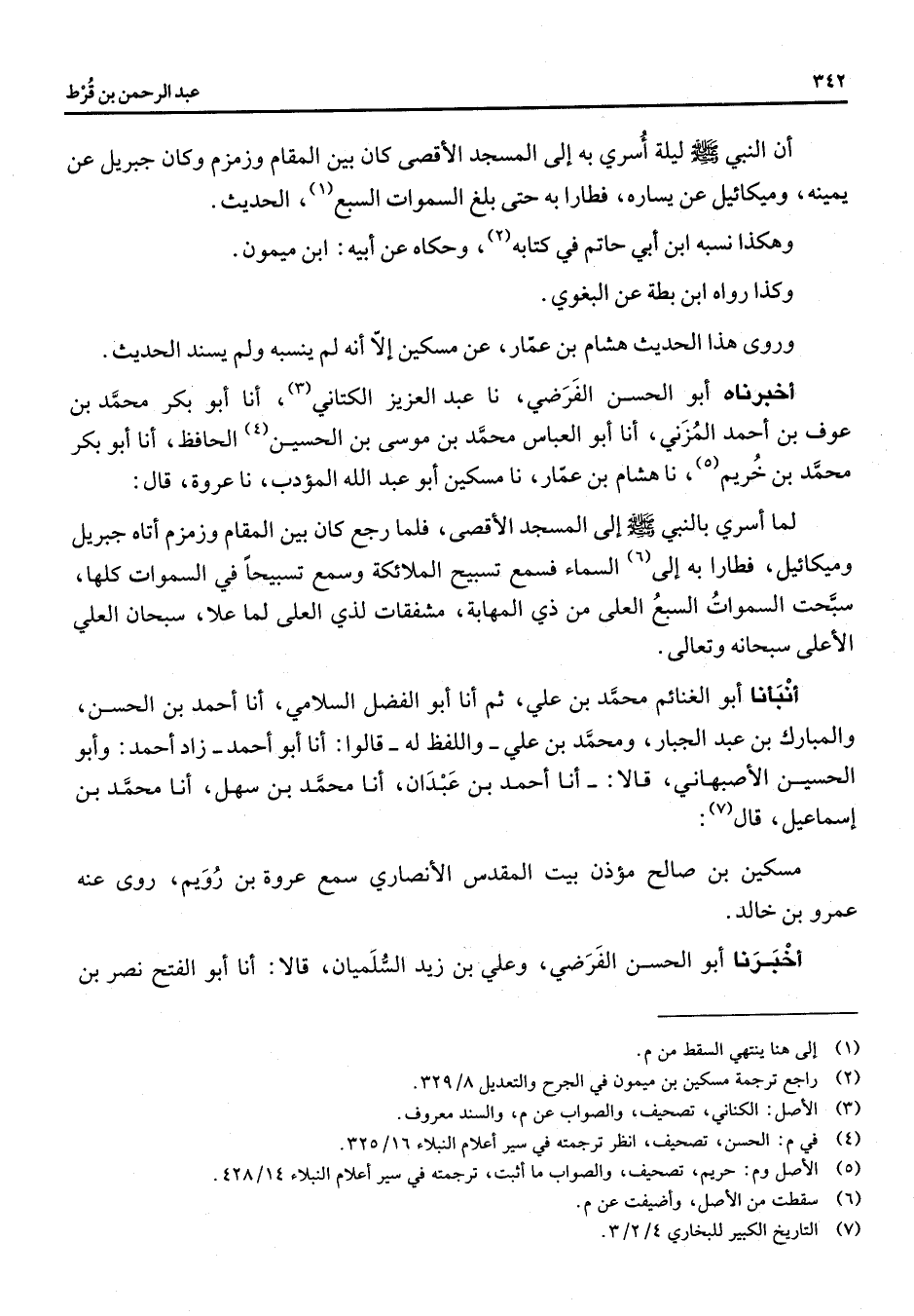 ان النبي (صلى الله عليه وسلم) ليلة أسري به الى المسجد الأقصى كان بين المقام وزمزم وكان جبريل عن يمينه وميكائيل عن يساره فطارا به حتى بلغ السموات السبع (1) الحديث وهكذا نسبه ابن ابي حاتم في كتابه (2) وحكاه عن أبيه ابن ميمون وكذا رواه ابن بطة عن البغوي وروى هذا الحديث هشام بن عمار عن مسكين الا انه لم ينسبه ولم يسند الحديث اخبرناه أبو الحسن الفرضي نا عبد العزيز الكتاني (3) انا أبو بكر محمد بن عوف بن احمد المزني انا أبو العباس محمد بن موسى بن الحسين (4) الحافظ انا أبو بكر محمد بن خريم (5) نا هشام بن عمار نا مسكين أبو عبد الله المؤدب نا عروة قال لما أسري بالنبي (صلى الله عليه وسلم) الى المسجد الأقصى فلما رجع كان بين المقام وزمزم اتاه جبريل وميكائيل فطارا به الى (6) السماء فسمع تسبيح الملائكة وسمع تسبيحا في السموات كلها سبحت السموات السبع العلى من ذي المهابة مشفقات لذي العلى لما علا سبحان العلي الأعلى سبحانه وتعالى انبأنا أبو الغنائم محمد بن علي ثم أنا أبو الفضل السلامي انا أحمد بن الحسن والمبارك بن عبد الجبار ومحمد بن علي واللفظ له قالوا انا أبو احمد زاد احمد وأبو الحسين الأصبهاني قالا انا أحمد بن عبدان انا محمد بن سهل انا محمد بن اسماعيل قال (7) مسكين بن صالح مؤذن بيت المقدس الأنصاري سمع عروة بن رويم روى عنه عمرو بن خالد أخبرنا أبو الحسن الفرضي وعلي بن زيد السلميان قالا انا أبو الفتح نصر بن