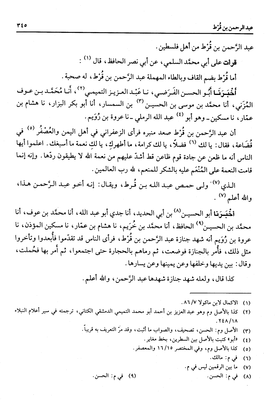 عبد الرحمن بن قرط من اهل فلسطين قرأت على أبي محمد السلمي عن ابي نصر الحافظ قال (1) أما قرط بضم القاف وبالطاء المهملة عبد الرحمن بن قرط له صحبة أخبرنا أبو الحسن الفرضي نا عبد العزيز التميمي (2) انا محمد بن عوف المزني انا محمد بن موسى بن الحسين (3) بن السمسار انا أبو بكر البزار نا هشام بن عمار نا مسكين وهو أبو (4) عبد الله الرملي نا عروة بن رويم ان عبد الرحمن بن قرط صعد منبره فرأى الزعفراني في اهل اليمن والعصفر (5) في قضاعة فقال يا لك (6) فضلا يا لك كرامة ما اطهرك يا لك نعمة ما أسبغك اعلموا ايها الناس انه ما ظعن عن جادة قوم ظاعن قط أشد عليهم من نعمة الله لا يطيقون ردها وانه انما قامت النعمة على المنعم عليه بالشكر للمنعم لله رب العالمين الذي (7) ولى حمص عبد الله بن قرط ويقال انه اخو عبد الرحمن هذا والله أعلم (7) اخبرنا أبو الحسين (8) بن أبي الحديد انا جدي أبو عبد الله انا محمد بن عوف انا محمد بن الحسين (9) الحافظ انا محمد بن خريم نا هشام بن عمار نا مسكين المؤذن نا عروة بن رويم انه شهد جنازة عبد الرحمن بن قرط فرأى الناس قد تقدموا فأبعدوا وتأخروا مثل ذلك فأمر بالجنازة فوضعت ثم رماهم بالحجارة حتى اجتمعوا ثم امر بها فحملت وقال بين يديها وخلفها وعن يمينها وعن يسارها كذا قال ولعله شهد جنازة شهدها عبد الرحمن والله اعلم
