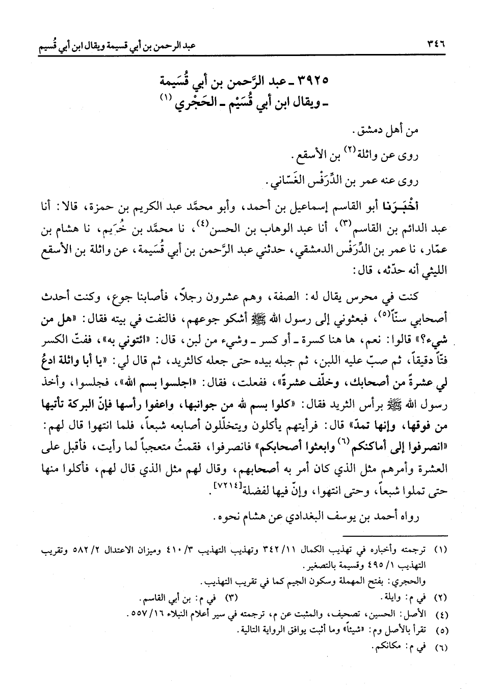 3925 - عبد الرحمن بن أبي قسيمة ويقال ابن أبي قسيم الحجري (1) من اهل دمشق روى عن واثلة (2) بن الأسقع روى عنه عمر بن الدرفس الغساني اخبرنا أبو القاسم اسماعيل بن احمد وأبو محمد عبد الكريم بن حمزة قالا انا عبد الدائم بن القاسم (3) انا عبد الوهاب بن الحسن نا محمد بن خريم نا هشام بن عمار نا عمر بن الدرفس الدمشقي حدثني عبد الرحمن بن أبي قسيمة عن واثلة بن الأسقع الليثي انه حدثه قال كنت في محرس يقال له الصفة وهم عشرون رجلا فأصابنا جوع وكنت احدث أصحابي سنا (5) فبعثوني الى رسول الله (صلى الله عليه وسلم) أشكو جوعهم فالتفت في بيته فقال هل من شئ قالوا نعم هاهنا كسرة أو كسر وشئ من لبن قال ائتوني به ففت الكسر فتا دقيقا ثم صب عليه اللبن ثم جبله بيده حتى جعله كالثريد ثم قال لي يا أبا واثلة ادع لي عشرة من أصحابك وخلف عشرة ففعلت فقال اجلسوا بسم الله فجلسوا وأخذ رسول الله (صلى الله عليه وسلم) برأس الثريد فقال كلوا بسم لله من جوانبها واعفوا رأسها فلإن البركة تأتيها من فوقها وإنها تمد قال فرأيتهم يأكلون ويتخللون أصابعه شبعا فلما انتهوا قال لهم انصرفوا الى اماكنكم (6) وابعثوا أصحابكم فانصرفوا فقمت متعجبا لما رأيت فأقبل على العشرة وأمرهم مثل الذي أمر به أصحابهم وقال لهم مثل الذي قال لهم فأكلوا منها حتى تملوا شبعا وحتى انتهوا وإن فيها لفضلة