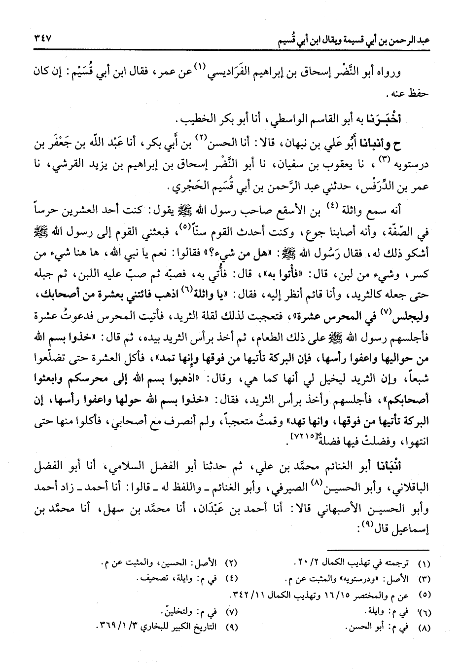 ورواه أبو النضر اسحاق بن ابراهيم الفراديسي (1) عن عمر فقال ابن ابي قسيم ان كان حفظ عنه اخبرنا به أبو القاسم الواسطي انا أبو بكر الخطيب ح وانبأنا أبو علي بن نبهان قالا انا الحسن (2) بن ابي بكر انا عبد الله بن جعفر بن درستويه (3) نا يعقوب بن سفيان نا أبو النضر اسحاق بن ابراهيم بن يزيد القرشي نا عمر بن الدرفس حدثني عبد الرحمن بن ابي قسيم الحجري انه سمع واثلة (4) بن الأسقع صاحب رسول الله (صلى الله عليه وسلم) يقول كنت احد العشرين حرسا في الصفة وانه اصابنا جوع وكنت احدث القوم سنا (5) فبعثني القوم الى رسول الله (صلى الله عليه وسلم) أشكو ذلك له فقال رسول الله (صلى الله عليه وسلم) هل من شئ فقالوا نعم يا نبي الله هاهنا شئ من كسر وشئ من لبن قال فأتوا به قال فأتي به فصبه ثم صب عليه اللبن ثم جبله حتى جعله كالثريد وانا قائم انظر إليه فقال يا واثلة (6) اذهب فائتني بعشرة من أصحابك وليجلس (7) في المحرس عشرة فتعجبت لذلك لقلة الثريد فأتيت المحرس فدعوت عشرة فأجلسهم رسول الله (صلى الله عليه وسلم) على ذلك الطعام ثم اخذ برأس الثريد بيده ثم قال خذوا بسم الله من حواليها واعفوا رأسها فان البركة تأتيها من فوقها وإنها تمد فأكل العشرة حتى تضلعوا شبعا وإن الثريد ليخيل لي انها كما هي وقال اذهبوا بسم الله الى محرسكم وابعثوا أصحابكم فأجلسهم وأخذ برأس الثريد فقال خذوا بسم الله حولها واعفوا رأسها ان البركة تأتيها من فوقها وانها تهد وقمت متعجبا ولم انصرف مع أصحابي فاكلوا منها حتى انتهوا وفضلت فيها فضلة