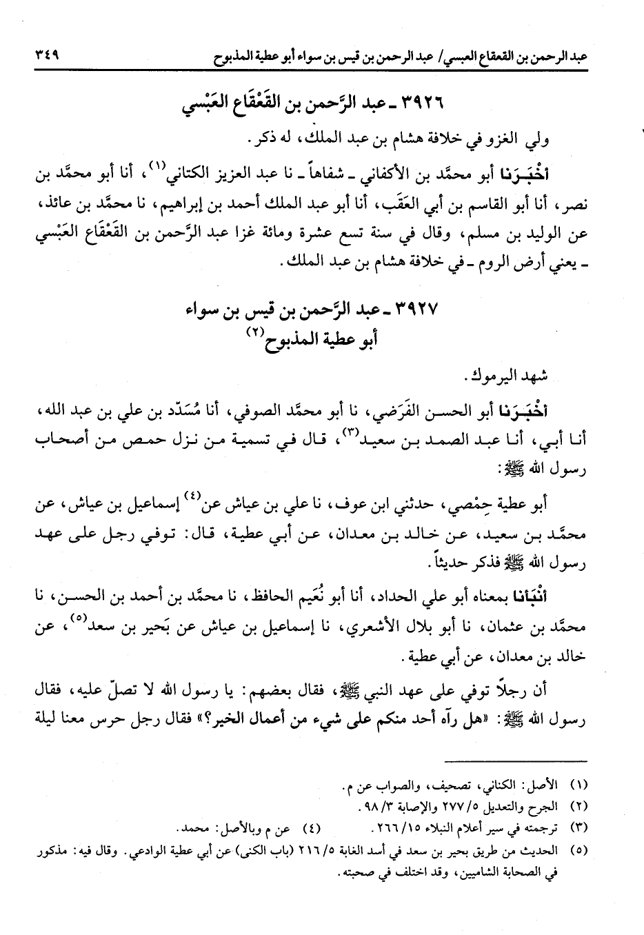 3926 - عبد الرحمن بن القعقاع العبسي ولي الغزو في خلافة هشام بن عبد الملك له ذكر اخبرنا أبو محمد بن الأكفاني شفاها نا عبد العزيز الكتاني (1) انا أبو محمد بن نصر أنا أبو القاسم بن أبي العقب انا أبو عبد الملك احمد بن ابراهيم نا محمد بن عائذ عن الوليد بن مسلم وقال في سنة تسع عشرة ومائة غزا عبد الرحمن بن القعقاع العبسي يعني أرض الروم في خلافة هشام بن عبد الملك 3927 - عبد الرحمن بن قيس بن سواء أبو عطية المذبوح (2) شهد اليرموك اخبرنا أبو الحسن الفرضي نا أبو محمد الصوفي انا مسدد بن علي بن عبد الله انا أبي انا عبد الصمد بن سعيد (3) قال في تسمية من نزل حمص من أصحاب رسول الله (صلى الله عليه وسلم) أبو عطية حمصي حدثني ابن عوف نا علي بن عياش عن (4) اسماعيل بن عياش عن محمد بن سعيد عن خالد بن معدان عن أبي عطية قال توفي رجل على عهد رسول الله (صلى الله عليه وسلم) فذكر حديثا انبأنا بمعناه أبو علي الحداد انا أبو نعيم الحافظ نا محمد بن احمد بن الحسن نا محمد بن عثمان نا أبو بلال الأشعري نا اسماعيل بن عياش عن بحير بن سعد (5) عن خالد بن معدان عن أبي عطية ان رجلا توفي على عهد النبي (صلى الله عليه وسلم) فقال بعضهم يارسول الله لا تصل عليه فقال رسول الله (صلى الله عليه وسلم) هل رآه احد منكم على شئ من اعمال الخير فقال رجل حرس معنا ليلة