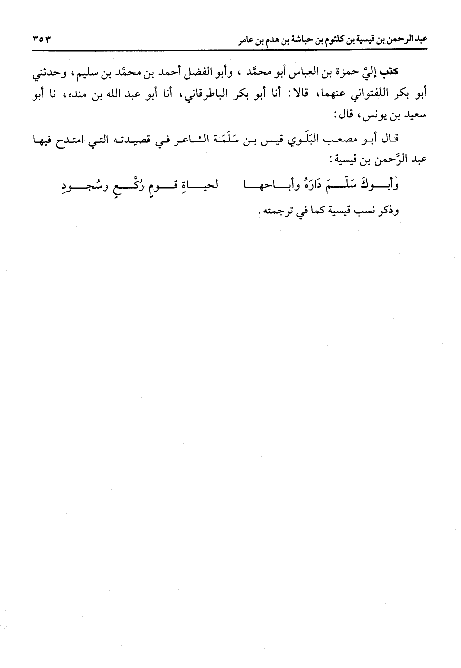 كتب الي حمزة بن العباس أبو محمد وابو الفضل احمد بن محمد بن سليم وحدثني أبو بكر اللفتواني عنهما قالا انا أبو بكر الباطرقاني انا أبو عبد الله بن منده نا أبو سعيد بن يونس قال قال أبو مصعب البلوي قيس بن سلمة الشاعر في قصيدته التى امتدح فيها عبد الرحمن بن قيسية وأبوك سلم داره وأباحها * لحياة قوم ركع وسجود وذكر نسب قيسية كما في ترجمته
