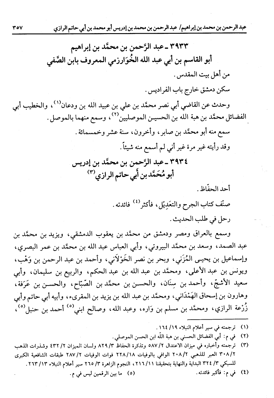3933 - عبد الرحمن بن محمد بن ابراهيم أبو القاسم بن ابي عبد الله الخوارزمي المعروف بابن الصفي من اهل بيت المقدس سكن دمشق خارج باب الفراديس وحدث عن القاضي ابي نصر محمد بن علي بن عبيد الله بن ودعان (1) والخطيب أبي الفضائل محمد بن هبة الله بن الحسين الموصليين (2) وسمع منهما بالموصل سمع منه أبو محمد بن صابر وأخرون سنة عشر وخمسمائة وقد رأيته غير مرة غير اني لم أسمع منه شيئا 3934 - عبد الرحمن بن محمد بن ادريس أبو محمد بن ابي حاتم الرازي (3) احد الحفاظ صنف كتاب الجرح والتعديل فأكثر (4) فائدته رحل في طلب الحديث وسمع باالعراق ومصر ودمشق من محمد بن يعقوب الدمشقي ويزيد بن محمد بن عبد الصمد وسعد بن محمد البيروتي وأبي العباس عبد الله بن محمد بن عمر البصري واسماعيل بن يحيى المزني وبحر بن نصر الخولاني واحمد بن عبد الرحمن بن وهب ويونس بن عبد الأعلى ومحمد بن عبد الله بن عبد الحكم والربيع بن سليمان وأبي سعيد الأشج وأحمد بن سنان والحسن بن محمد بن الصباح والحسن بن عرفة وهارون بن اسحاق الهمداني ومحمد بن عبد الله بن يزيد بن المقرئ وأبيه ابي حاتم وأبي زرعة الرازي ومحمد بن مسلم بن واره وعبد الله وصالح ابني (5) احمد بن حنبل (5)