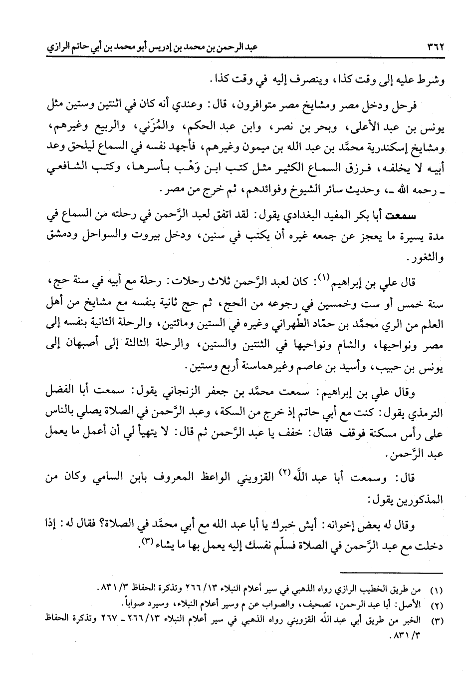 وشرط عليه الى وقت كذا وينصرف إليه في وقت كذا فرحل ودخل مصر ومشايخ مصر متوافرون قال وعندي انه كان في اثنتين وستين مثل يونس بن عبد الأعلى وبحر بن نصر وابن عبد الحكم والمزني والربيع وغيرهم ومشايخ اسكندرية محمد بن عبد الله بن ميمون وغيرهم فأجهد نفسه في السماع ليلحق وعد أبيه لا يخلفه فرزق السماع الكثير مثل كتب ابن وهب بأسرها وكتب الشافعي رحمه الله وحديث سائر الشيوخ وفوائدهم ثم خرج من مصر سمعت أبا بكر المفيد البغدادي يقول لقد اتفق لعبد الرحمن في رحلته من السماع في مدة يسيرة ما يعجز عن جمعه غيره ان يكتب في سنين ودخل بيروت والسواحل ودمشق والثغور قال علي بن ابراهيم (1) كان لعبد الرحمن ثلاث رحلات رحلة مع ابيه في سنة حج سنة خمس أو ست وخمسين في رجوعه من الحج ثم حج ثانية بنفسه مع مشايخ من أهل العلم من الري محمد بن حماد الطهراني وغيره في الستين ومائتين والرحلة الثانية بنفسه الى مصر ونواحيها والشام ونواحيها في الثنتين والستين والرحلة الثالثة الى أصبهان الى يونس بن حبيب وأسيد بن عاصم وغيرهما سنة أربع وستين وقال علي بن ابراهيم سمعت محمد بن جعفر الزنجابي يقول سمعت أبا الفضل الترمذي يقول كنت مع أبي حاتم إذ خرج من السكة وعبد الرحمن في الصلاة يصلي بالناس على رأس مسكنة فوقف فقال خفف يا عبد الرحمن ثم قال لا يتهيأ لي ان اعمل ما يعمل عبد الرحمن قال وسمعت أبا عبد الله (2) القزويني الواعظ المعروف بابن السامي وكان من المذكورين يقول وقال له بعض اخوانه أيش خبرك يا أبا عبد الله مع ابي محمد في الصلاة فقال له إذا دخلت مع عبد الرحمن في الصلاة فسلم نفسك إليه يعمل بها ما يشاء (3)