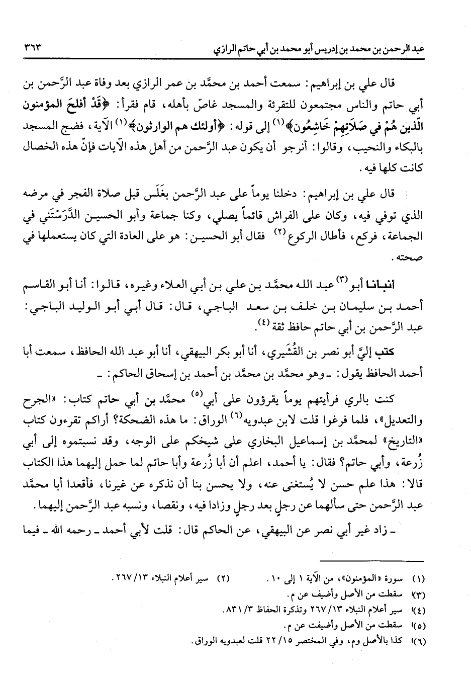 قال علي بن ابراهيم سمعت احمد بن محمد بن عمر الرازي بعد وفاة عبد الرحمن بن ابي حاتم والناس مجتمعون للتقرئة والمسجد غاص بأهله قام فقرأ " قد أفلح المؤمنون الذين هم في صلاتهم خاشعون " (1) الى قوله " اولئك هم الوارثون " (1) الآية فضج المسجد بالبكاء والنحيب وقالوا أنرجو ان يكون عبد الرحمن من اهل هذه الآيات فإن هذه الخصال كانت كلها فيه قال علي بن ابراهيم دخلنا يوما على عبد الرحمن بغلس قبل صلاة الفجر في مرضه الذي توفي فيه وكان على الفراش قائما يصلي وكنا جماعة وأبو الحسين الدرستني في الجماعة فركع فأطال الركوع (2) فقال أبو الحسين هو على العادة التى كان يستعملها في صحته انبأنا أبو (3) عبد الله محمد بن علي بن ابي العلاء وغيره قالوا انا أبو القاسم أحمد بن سليمان بن خلف بن سعد الباجي قال قال أبي أبو الوليد الباجي عبد الرحمن بن ابي حاتم حافظ ثقة (4) كتب إلي أبو نصر بن القشيري انا أبو بكر البيهقي انا أبو عبد الله الحافظ سمعت ابا أحمد الحافظ يقول وهو محمد بن محمد بن احمد بن اسحاق الحاكم كنت بالري فرأيتهم يوما يقرؤون على أبي (5) محمد بن ابي حاتم كتاب الجرح والتعديل فلما فرغوا قلت لابن عبدويه (6) الوراق ما هذه الضحكة اراكم تقرءون كتاب التاريخ لمحمد بن اسماعيل البخاري على شيخكم على الوجه وقد نسبتموه الى ابي زرعة وأبي حاتم فقال يا أحمد اعلم ان أبا زرعة وأبا حاتم لما حمل اليهما هذا الكتاب قالا هذا علم حسن لا يستغنى عنه ولا يحسن بنا ان نذكره عن غيرنا فأقعدا أبا محمد عبد الرحمن حتى سألهما عن رجل بعد رجل وزادا فيه ونقصا ونسبه عبد الرحمن اليهما زاد غير ابي نصر عن البيهقي عن الحاكم قال قلت لأبي أحمد رحمه الله فيهما