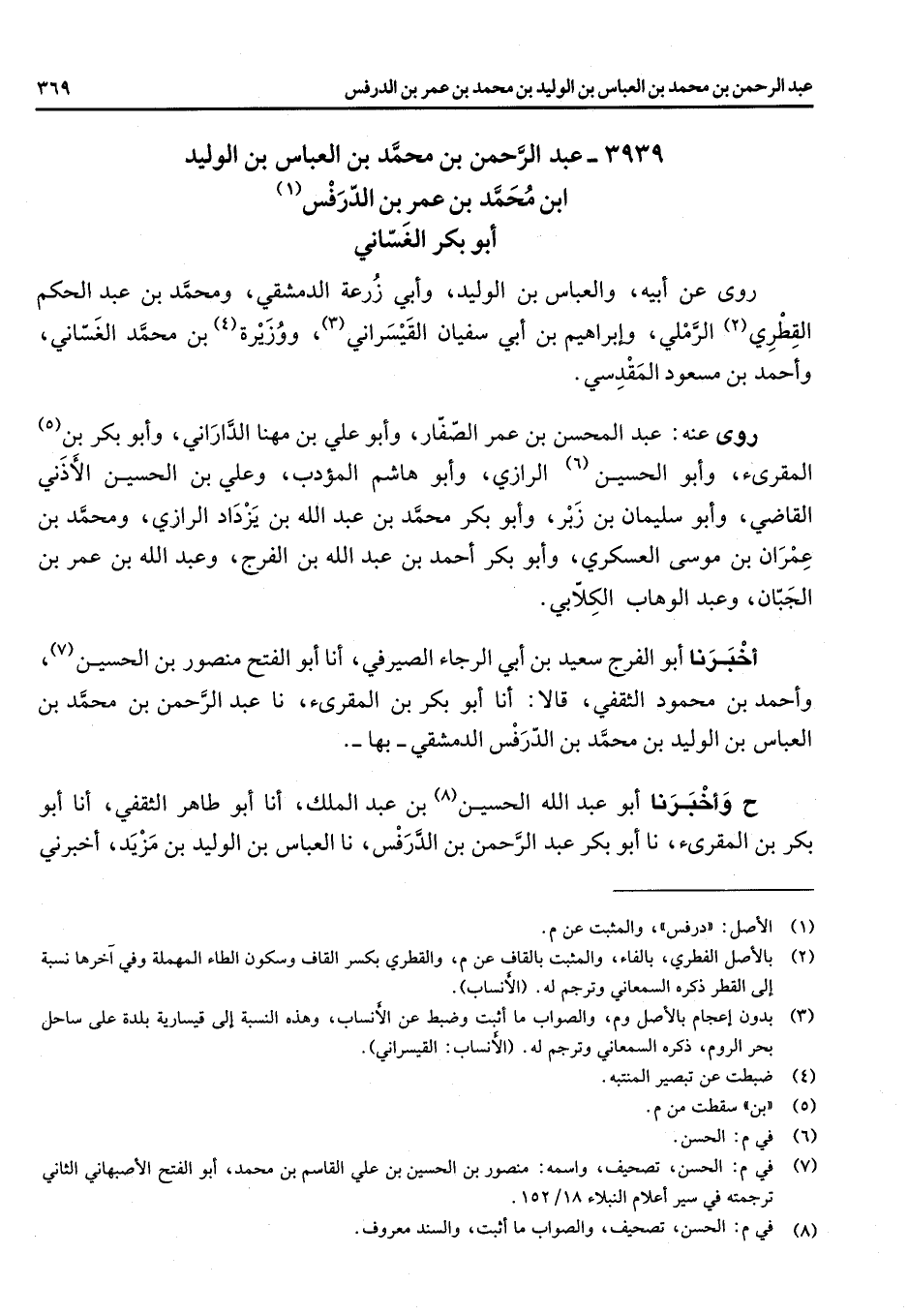 3939 - عبد الرحمن بن محمد بن العباس بن الوليد ابن محمد بن عمر بن الدرفس (1) أبو بكر الغساني روى عن أبيه والعباس بن الوليد وأبي زرعة الدمشقي ومحمد بن عبد الحكم القطري (2) الرملي وإبراهيم بن أبي سفيان القيسراني (3) ووزيرة (4) بن محمد الغساني وأحمد بن مسعود المقدسي روى عنه عبد المحسن بن عمر الصفار وأبو علي بن مهنا الداراني وأبو بكر بن (5) المقرئ وابو الحسين (6) الرازي وأبو هاشم المؤدب وعلي بن الحسين الأذين القاضي وأبو سليمان بن زبر وأبو بكر محمد بن عبد الله بن يزداد الرازي ومحمد بن عمران بن موسى العسكري وأبو بكر احمد بن عبد الله بن الفرج وعبد الله بن عمر بن الجبان وعبد الوهاب الكلابي اخبرنا أبو الفرج سعيد بن ابي الرجاء الصيرفي انا أبو الفتح منصور بن الحسين (7) وأحمد بن محمود الثقفي قالا انا أبو بكر بن المقرئ نا عبد الرحمن بن محمد بن العباس بن الوليد بن محمد بن الدرفس الدمشقي بها ح وأخبرنا أبو عبد الله الحسين (8) بن عبد الملك انا أبو طاهر الثقفي انا أبو بكر بن المقرئ نا أبو بكر عبد الرحمن بن الدرفس نا العباس بن الوليد بن مزيد اخبرني