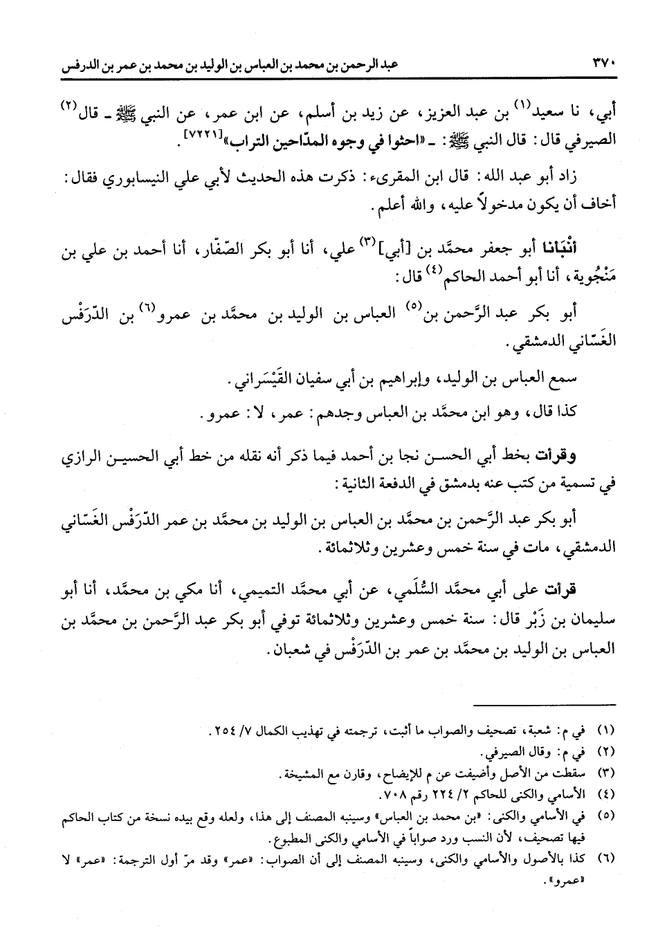 [7221] زاد أبو عبد الله قال ابن المقرئ ذكرت هذه الحديث لأبي علي النيسابوري فقال اخاف ان يكون مدخولا عليه والله أعلم انبأنا أبو جعفر محمد بن [أبي] (3) علي انا أبو بكر الصفار انا احمد بن علي بن منجوية انا أبو احمد الحاكم (4) قال أبو بكر عبد الرحمن بن (5) العباس بن الوليد بن محمد بن عمرو (6) بن الدرفس الغساني الدمشقي سمع العباس بن الوليد وابراهيم بن ابي سفيان القيسراني كذا قال وهو ابن محمد بن العباس وجدهم عمر لا عمرو وقرأت بخط أبي الحسن نجا بن احمد فيما ذكر انه نقله من خط ابي الحسين الرازي في تسمية من كتب عنه بدمشق في الدفعة الثانية أبو بكر عبد الرحمن بن محمد بن العباس بن الوليد بن محمد بن عمر الدرفس الغساني الدمشقي مات في سنة خمس وعشرين وثلاثمائة قرأت على ابي محمد السلمي عن أبي محمد التميمي انا مكي بن محمد انا أبو سليمان بن زبر قال سنة خمس وعشرين وثلاثمائة توفي أبو بكر عبد الرحمن بن محمد بن العباس بن الوليد بن محمد بن عمر بن الدرفس في شعبان