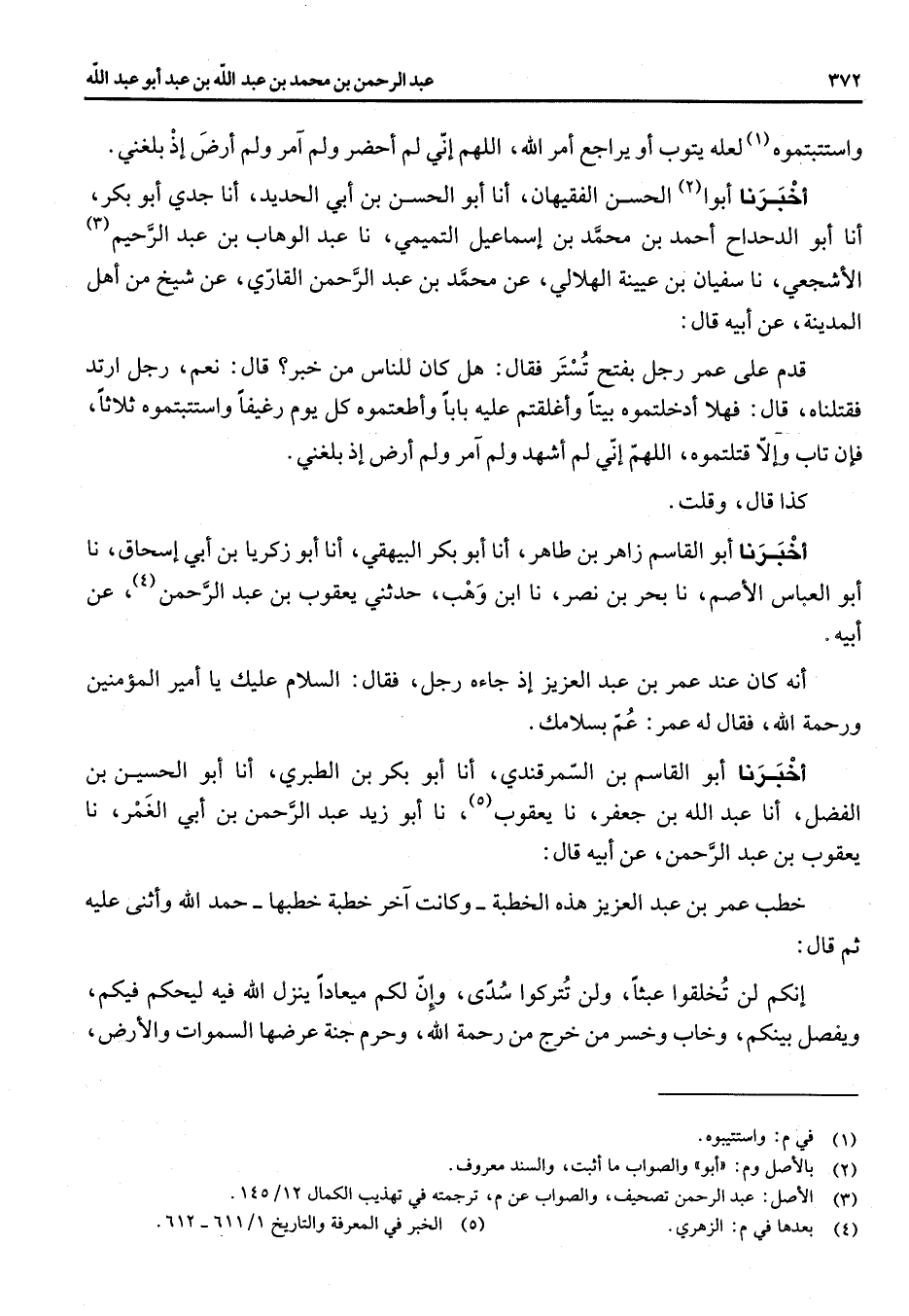 واستتبتموه (1) لعله يتوب أو يراجع امر الله اللهم إني لم احضر ولم آمر ولم ارض إذ بلغني اخبرنا أبوا (2) الحسن الفقيهان انا أبو الحسن بن ابي الحديد انا جدي أبو بكر انا أبو الدحداح احمد بن محمد بن اسماعيل التميمي نا عبد الوهاب بن عبد الرحيم (3) الأشجعي نا سفيان بن عيينة الهلالي عن محمد بن عبد الرحمن القاري عن شيخ من أهل المدينة عن ابيه قال قدم على عمر رجل بفتح تستر فقال هل كان للناس من خبر قال نعم رجل ارتد فقتلناه قال فهلا أدخلتموه بيتا وأغلقتم عليه بابا وأطعمتموه كل يوم رغيفا واستتبتموه ثلاثا فان تاب والا قتلتموه اللهم إني لم أشهد ولم آمر ولم أرض إذ بلغني كذا قال وقلت اخبرنا أبو القاسم زاهر بن طاهر انا أبو بكر البيهقي انا أبو زكريا بن ابي اسحاق نا أبو العباس الأصم نا بحر بن نصر نا ابن وهب حدثني يعقوب بن عبد الرحمن (4) عن أبيه انه كان عند عمر بن عبد العزيز إذ جاءه رجل فقال السلام عليك يا امير المؤمنين ورحمة الله فقال له عمر عم بسلامك اخبرنا أبو القاسم بن السمرقندي انا أبو بكر بن الطبري انا أبو الحسين بن الفضل انا عبد الله بن جعفر نا يعقوب (5) نا أبو زيد عبد الرحمن بن ابي الغمر نا يعقوب بن عبد الرحمن عن أبيه قال خطب عمر بن عبد العزيز هذه الخطبة وكانت آخر خطبة خطبها حمد الله وأثنى عليه ثم قال انكم لن تخلقوا عبثا ولن تتركوا سدى وان لكم ميعادا ينزل الله فيه ليحكم فيكم ويفصل بينكم وخاب وخسر من خرج من رحمة الله وحرم جنة عرضها السموات والارض