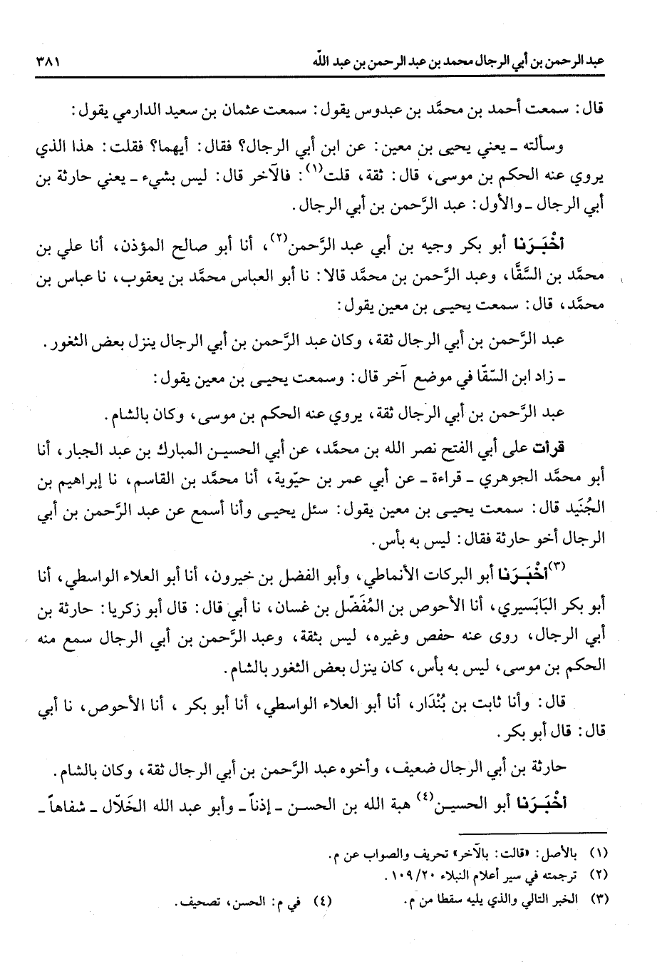 قال سمعت أحمد بن محمد بن عبدوس يقول سمعت عثمان بن سعيد الدارمي يقول وسألته يعني يحيى بن معين عن ابن ابي الرجال فقال أيهما فقلت هذا الذي يروي عنه الحكم بن موسى قال ثقة قلت (1) فالآخر قال ليس بشئ يعني حارثة بن أبي الرجال والأول عبد الرحمن بن أبي الرجال أخبرنا أبو بكر وجيه بن أبي عبد الرحمن (2) انا أبو صالح المؤذن انا علي بن محمد بن السقا وعبد الرحمن بن محمد قالا نا أبو العباس محمد بن يعقوب نا عباس بن محمد قال سمعت يحيى بن معين يقول عبد الرحمن بن أبي الرجال ثقة وكان عبد الرحمن بن أبي الرجال ينزل بعض الثغور زاد ابن السقا في موضع آخر قال وسمعت يحيى بن معين يقول عبد الرحمن بن أبي الرجال ثقة يروي عنه الحكم بن موسى وكان بالشام قرأت على أبي الفتح نصر الله بن محمد عن أبي الحسين المبارك بن عبد الجبار أنا أبو محمد الجوهري قراءة عن أبي عمر بن حيوية أنا محمد بن القاسم نا ابراهيم بن الجنيد قال سمعت يحيى بن معين يقول سئل يحيى وانا أسمع عن عبد الرحمن بن أبي الرجال أخو حارثة فقال ليس به بأس (3) أخبرنا أبو البركات الأنماطي وأبو الفضل بن خيرون انا أبو العلاء الواسطي أنا أبو بكر البابسيري انا الأحوص بن المفضل بن غسان نا أبي قال قال أبو زكريا حارثة بن أبي الرجال روى عنه حفص وغيره ليس بثقة وعبد الرحمن بن أبي الرجال سمع منه الحكم بن موسى ليس به بأس كان ينزل بعض الثغور بالشام قال وانا ثابت بن بندار أنا أبو العلاء الواسطي انا أبو بكر أنا الأحوص نا أبي قال قال أبو بكر حارثة بن أبي الرجال ضعيف واخوه عبد الرحمن بن أبي الرجال ثقة وكان بالشام اخبرنا أبو الحسين (4) هبة الله بن الحسن اذنا وأبو عبد الله الخلال شفاها
