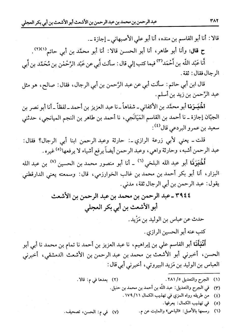 قالا انا أبو القاسم بن منده انا أبو علي الأصبهاني اجازة ح قال وانا أبو طاهر انا أبو الحسن قالا انا أبو محمد بن أبي حاتم (1) (2) انا عبد الله بن احمد (3) فيما كتب الي قال سألت أبي عن عبد الرحمن بن محمد بن أبي الرجال فقال ثقة قال ابن أبي حاتم سألت ابي عن عبد الرحمن بن أبي الرجال فقال صالح هو مثل عبد الرحمن بن زيد بن أسلم اخبرنا أبو محمد بن الأكفاني شفاها نا عبد العزيز بن أحمد لفظا أنا أبو نصر بن الجبان اجازة نا أحمد بن القاسم الميانجي نا احمد بن طاهر بن النجم الميانجي حدثني سعيد بن عمرو البردعي قال (4) قلت يعني لابي زرعة الرازي حارثة وعبد الرحمن ابنا ابن أبي الرجال فقال عبد الرحمن أشبه وحارثة واهي وعبد الرحمن ايضا يرفع أشياء لا يرفعها (5) غيره اخبرنا أبو عبد الله البلخي (6) انا أبو منصور محمد بن الحسين (7) بن عبد الله البزار انا أبو بكر أحمد بن محمد بن غالب الخوارزمي قال وسمعته يعني الدارقطني يقول عبد الرحمن بن أبي الرجال ثقة مدني 3944 - عبد الرحمن بن محمد بن عبد الرحمن بن الأشعث أبو الأشعث بن أبي بكر العجلي حدث عن عباس بن الوليد بن مزيد كتب عنه أبو الحسين الرازي انبأنا أبو القاسم علي بن ابراهيم نا عبد العزيز بن احمد نا تمام بن محمد نا أبي أبو الحسن أخبرني أبو الأشعث بن محمد بن عبد الرحمن بن الأشعث الدمشقي أخبرني العباس بن الوليد بن مزيد البيروتي أخبرني أبي قال