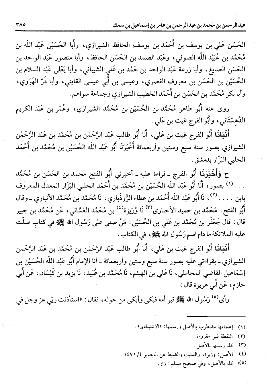 (2) نا أبو عبد الله احمد بن عطاء الروذباري نا محمد بن محمد الأنباري وقال أبو الفتح محمد بن حميد الأحارى (3) نا وريزة (4) بن محمد الغساني عن محمد بن جبير قال قال جعفر بن محمد بن علي بن الحسين من صلى على رسول الله (صلى الله عليه وسلم) في كتاب صلت عليه الملائكة مادام اسم رسول الله (صلى الله عليه وسلم) في الكتاب انبأنا أبو الفرج غيث بن علي انا أبو طالب عبد الرحمن بن محمد بن عبد الرحمن الشيرازي بقراءتي عليه بصور سنة سبع وستين وأربعمائة انا الامام أبو عبد الله الحسين بن اسماعيل القاضي المحاملي نا علي بن الهيثم نا محمد بن عبيد نا يزيد بن كيسان عن أبي حازم عن أبي هريرة قال رأى (5) رسول الله (صلى الله عليه وسلم) قبر امه فبكى وأبكى من حوله فقال استأذنت ربي عز وجل في