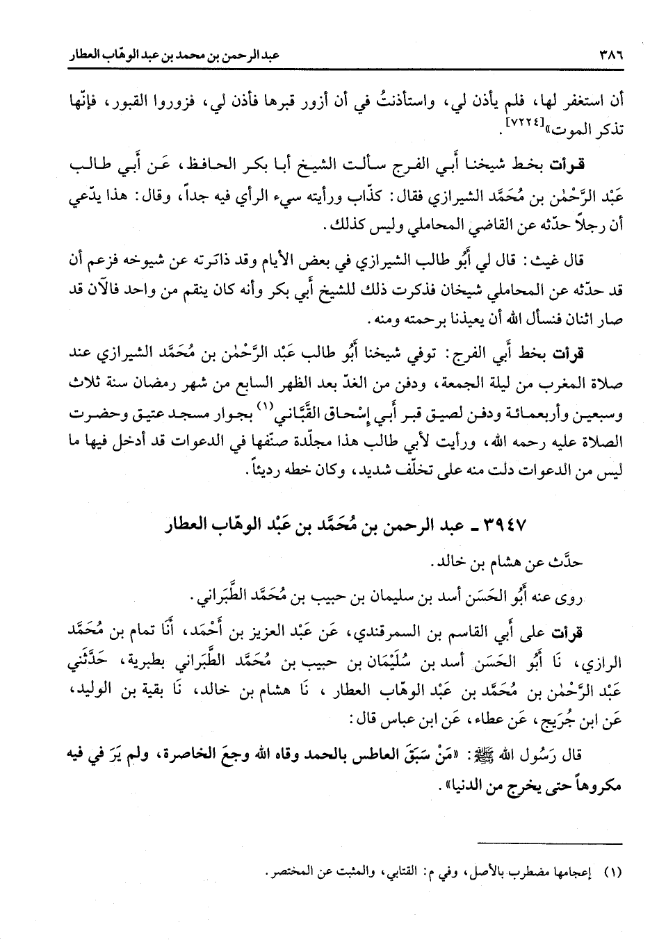[7224] قرأت بخط شيخنا أبي الفرج سألت الشيخ أبا بكر الحافظ عن أبي طالب عبد الرحمن بن محمد الشيرازي فقال كذاب ورأيته سئ الرأي فيه جدا وقال هذا يدعي ان رجلا حدثه عن القاضي المحاملي وليس كذلك قال غيث قال لي أبو طالب الشيرازي في بعض الأيام وقد ذاكرته عن شيوخه فزعم أن قد حدثه عن المحاملي شيخان فذكطرت ذلك للشيخ أبي بكر وانه كان ينقم من واحد فالان قد صار اثنان فنسأل الله أن يعيذنا برحمته ومنه قرأت بخط أبي الفرج توفي شيخنا أبو طالب عبد الرحمن بنمحمد الشيرازي عند صلاة المغرب من ليلة الجمعة ودفن من الغد بعد الظهر السابع من شهر رمضان سنة ثلاث وسبعين وأربعمائة ودفن لصيق قبر أبي اسحاق القباني (1) بجوار مسجد عتيق وحضرت الصلاة عليه رحمه الله ورأيت لأبي طالب هذا مجلد صنفها في الدعوات قد أدخل فيها ليس من الدعوات دلت منه على تخلف شديد وكان خطه رديئا 3947 - عبد الرحمن بن محمد بن عبد الوهاب العطار حدث عن هشام بن خالد روى عنه أبو الحسن أسد بن سليمان بن حبيب بن محمد الطبراني قرأت على ابي القاسم بن السمرقندي عن عبد العزيز بن احمد انا تمام بن محمد الرازي نا أبو الحسن أسد بن سليمان بن حبيب بن محمد الطبراني بطبرية حدثني عبد الرحمن بن محمد بن عبد الوهاب العطار نا هشام بن خالد نا بقية بن الوليد عن ابن جريج عن عطاء عن ابن عباس قال قال رسول الله (صلى الله عليه وسلم) من سبق العاطس بالحمد وقاه الله وجع الخاصرة ولم ير في فيه مكروها حتى يخرج من الدنيا