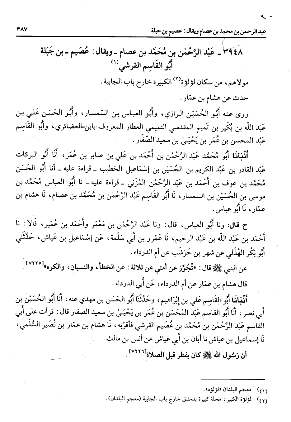 3948 - عبد الرحمن بن محمد بن عصام ويقال عصيم بن جبلة أبو القاسم القرشي (1) مولاهم من سكان لؤلؤة (2) الكبيرة خارج باب الجابية حدث عن هشام بن عمار روى عنه أبو الحسين الرازي وأبو العباس بن السمسار وأبو الحسن علي بن عبد الله بن بكير بن تميم المقدسي التميمي العطار المعروف بابن العضائري وأبو القاسم عبد المحسن بن عمر بن يحيى بن سعيد الصفار انبأنا أبو محمد عبد الرحمن بن احمد بن علي بن صابر بن عمر انا أبو البركات عبد القادر بن عبد الكريم بن الحسين بن اسماعيل الخطيب قراءة عليه انا أبو الحسن محمد بن عوف بن احمد بن عبد الرحمن المزني قراءة عليه نا أبو العباس محمد بن موسى بن الحسين بن السمسار نا أبو القاسم عبد الرحمن بن محمد بن عصام نا هشام بن عمار نا أبو عباس ح قال ونا أبو العباس قال ونا عبد الرحمن بن معمر واحمد بن عمير قالا نا احمد بن عبد الله بن عبد الرحيم ناعمرو بن أبي سلمة عن اسماعيل بن عياش حدثني أبو بكر الهذلي عن شهر بن حوشب عن ام الدرداء عن (صلى الله عليه وسلم) النبي قال تجوز عن امتي عن ثلاثة عن الخطأ والنسيان والكره