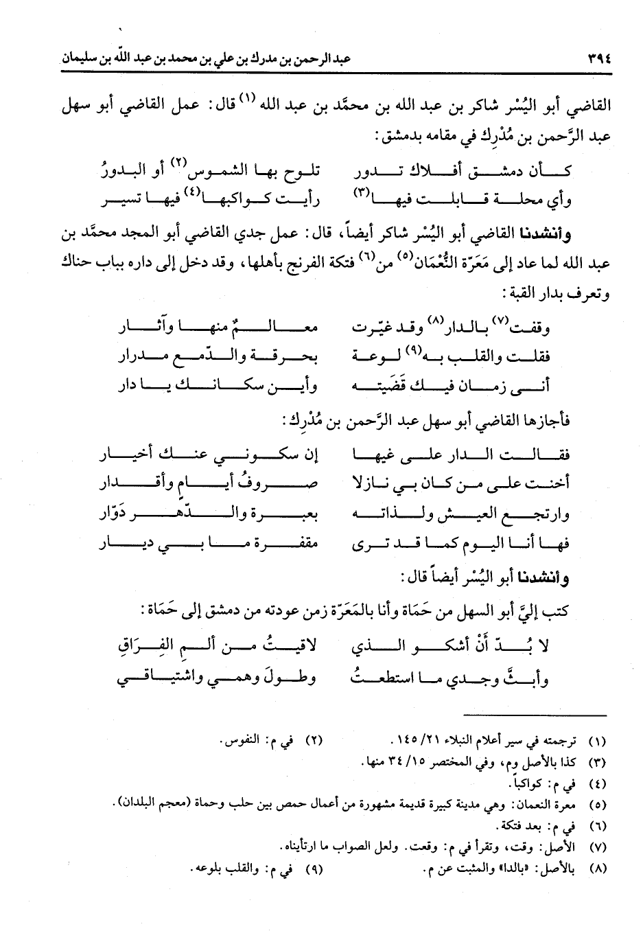 القاضي أبو اليسر شاكر بن عبد الله بن محمد بن عبد الله (1) قال عمل القاضي أبو سهل عبد الرحمن بن مدرك في مقامه بدمشق كأن دمشق أفلاك تدور * تلوح بها الشموس (2) أو البدور وأي محلة قابلت فيها (3) * رأيت كواكبها (4) فيها تسير * وانشدنا القاضي أبو اليسر شاكر أيضا قال عمل جدي القاضي أبو المجد محمد بن عبد الله لما عاد الى معرة النعمان (5) من (6) فتكة الفرنج بأهلها وقد دخل الى داره بباب حناك وتعرف بدار القبة وقفت بالدار (8) وقد غيرت * معالم منها وآثار فقلت والقلب به (9) لوعة * بحرقة والدمع مدرار أنى زمان فيك قضيته * وأين سكانك يادار * فأجازها القاضي أبو سهل عبد الرحمن بن مدرك فقالت الدار على غيها * ان سكوني عنك أخيار أحننت على من كان بي نازلا * صروف أيام وأقدار وارتجع العيش ولذاته * بعبرة والدهر دوار فها أنا اليوم كما قد ترى * مقفرة ما بي ديار * وأنشدنا أبو اليسر ايضا قال كتب الي أبو السهل من حماة وانا بالمعرة زمن عودته من دمشق الى حماة لابد أن أشكو الذي * لاقيت من ألم الفراق وأبث وجدي ما استطعت * وطول وهمي واشتياقي