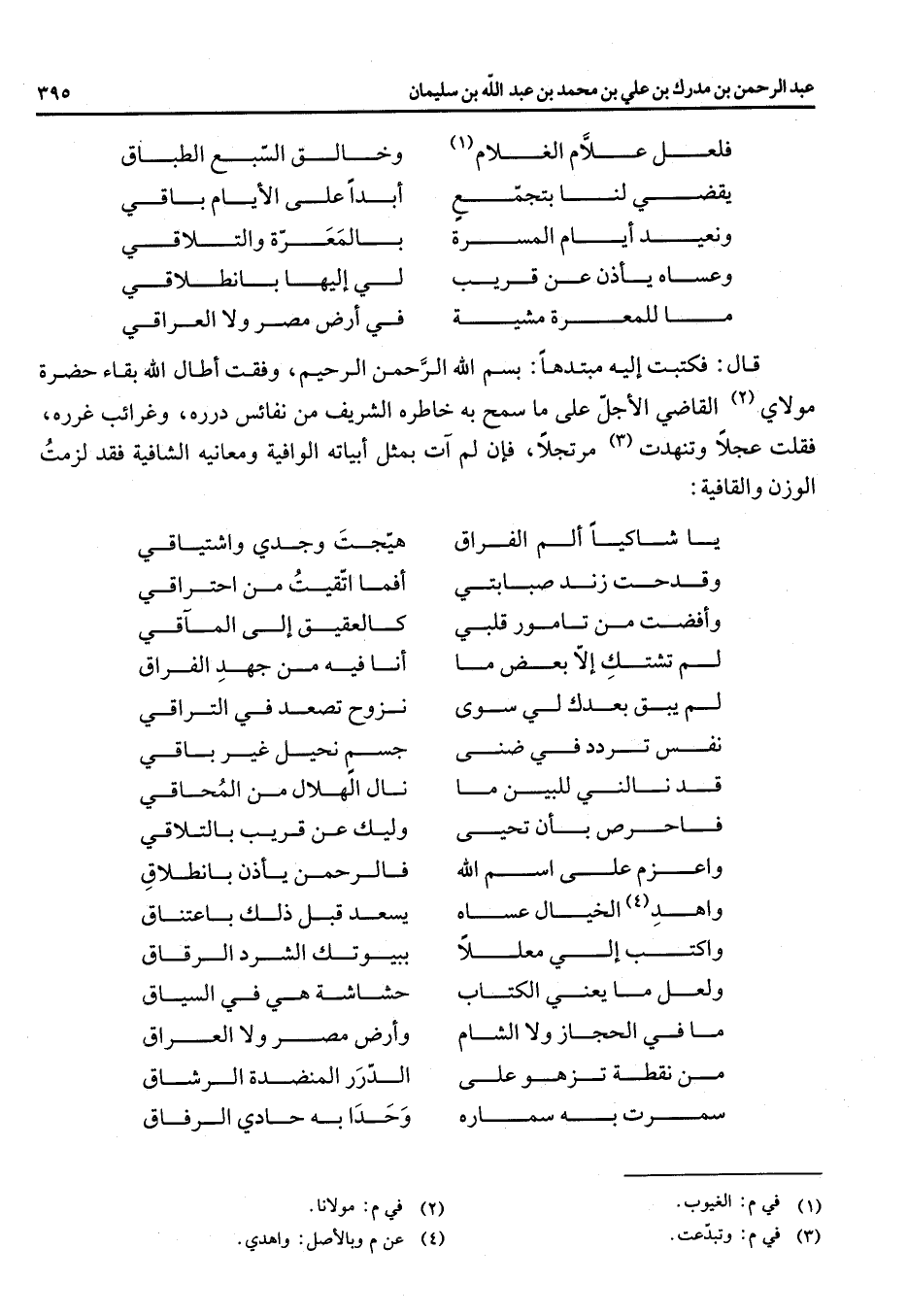 فلعل علام الغلام (1) * وخالق السبع الطباق يقضي لنا بتجمع * أبدا على الأيام باقي ونعيد أيام المسرة * بالمعرة والتلاقي وعساه يأذن عن قريب * لي إليها بانطلاقي ما للمعرة مشية * في ارض مصر ولا العراقي * قال فكتبت إليه مبتدها بسم الله الرحمن الرحيم وفقت اطال الله بقاء حضرة مولاي (2) القاضي الأجل على ما سمح به خاطره الشريف من نفائس درره وغرائب غرره فقلت عجلا وتنهدت (3) مرتجلا فان لم آتت بمثل أبياته الوافية ومعانيه الشافية فقد لزمت الوزن والقافية يا شاكيا ألم الفراق * هيجت وجدي واشتياقي وقدحت زند صبابتي * أفما اتقيت من احتراقي وأفضت من تامور قلبي * كالعقيق الى المآقي لم تشتك الا بعض ما * انا فيه من جهد الفراق لم يبق بعدك لي سوى * نزوح تصعد في التراقي نفسي تردد في ضنى * جسم نحيل غير باقي قد نالني للبين ما * نال الهلال من المحاقي فاحرص بأن تحيى * وليك عن قريب بالتلاقي واعزم على اسم الله * فالرحمن يأذن بانطلاق واهد (4) الخيال عساه * يسعد قبل ذلك باعتناق واكتب الي معللا * ببيوتك الشرد الرفاق ولعل ما يعني الكتاب * حشاشة هي في السياق ما في الحجاز ولا الشام * وأرض مصر ولا العراق من نقطة تزهو على * الدرر المنضدة الرشاق سمرت به سماره * وحدا به حادي الرفاق