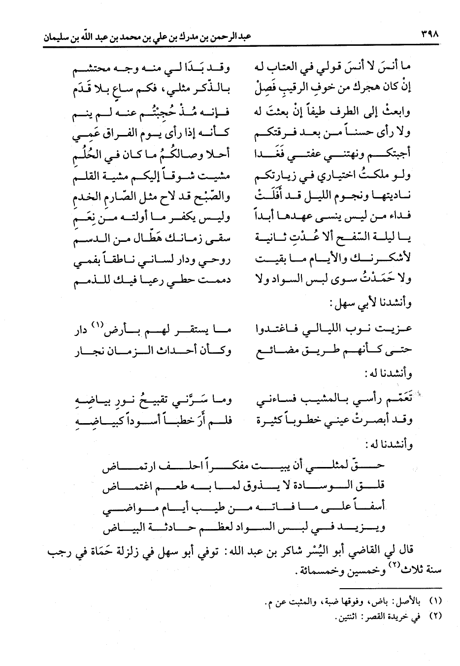 ما انس لا انس قولي في العتاب له * وقد بدا لي منه وجه محتشم ان كان هجرك من خوف الرقيب فصل * بالذكر مثلي فكم ساع بلا قدم وابعث الى الطرف طيفا ان بعثت له * فانه مذ حججتم عنه لم ينم ولا رأى حسنا من بعد فرقتكم * كأنه إذا رأى يوم الفراق عمي أجبتكم ونهتني عفتي فغدا * احلا وصالكم ماكان في الحلم ولو ملكت اختياري في زيارتكم * مشيت شوقا اليكم مشية القلم ناديتها ونجوم الليل قد أفلت * والصبح قد لاحت مثل الصارم الخدم فداء من ليس ينسى عهدها ابدا * وليس بكفر ما أولته من نعم يا ليلة السفح الا عدت ثانية * سقى زمانك هطال من الدسم لأشكرنك والأيام ما بقيت * روحي ودار لساني ناطقا بفمي ولا حمدت سوى لبس السواد ولا * دممت حطي رعيا فيك للذمم * وأنشدنا لأبي سهل عزيت نوب الليالي فاغتدوا * ما يستقر لهم بأرض (1) دار حتى كأنهم طريق مضائع * وكأن أحداث الزمان نجار * وأنشدنا له تعمم رأسي بالمشيب فساءني * وما سرني تقبيح نور بياضه وقد أبصرت عيني خطوبا كثيرة * فلم أر خطبا أسودا كبياضه * وانشدنا له حق لمثلي أن يبيت مفكرا أحلف ارتماض * قلق الوسادة لا يذوق لما به طعم اغتماض اسفا على ما فاته من طيب أيام مواضي * ويزيد في لبس السواد لعظم حادثة البياض * قال لي القاضي أبو اليسر شاكر بن عبد الله توفي أبو سهل في زلزلة حماة في رجب سنة ثلاث (2) وخمسين وخمسمائة
