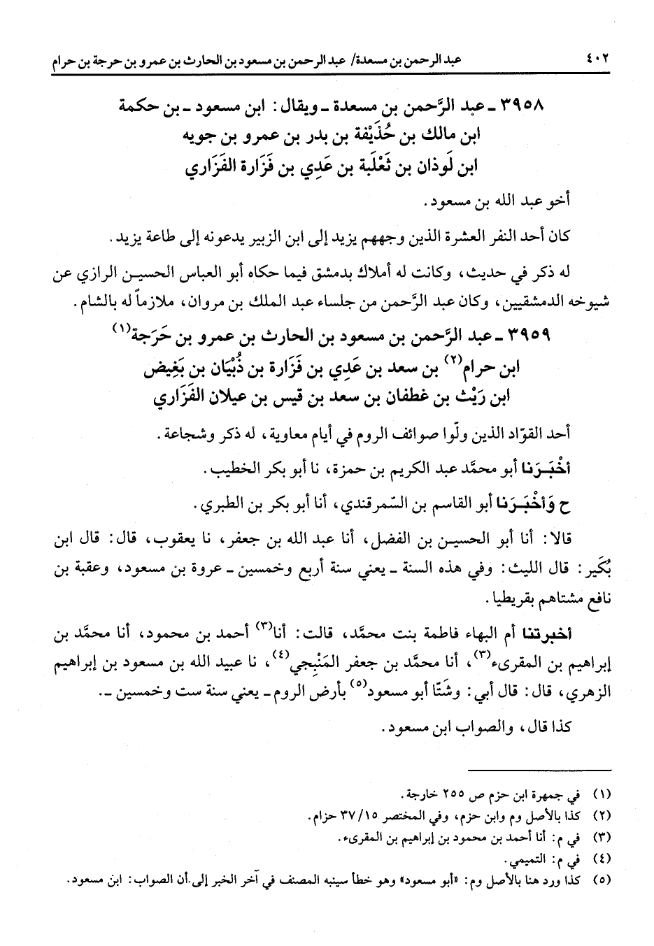 3959 - عبد الرحمن بن مسعود بن الحارث بن عمرو بن حرجة (1) ابن حرام (2) بن سعد بن عدي بن فزارة بن ذبيان بن بغيض ابن ريث بن غطفان بن سعد بن قيس بن عيلان الفزاري أحد القواد الذين ولوا صوائف الروم في أيام معاوية له ذكر وشجاعة اخبرنا أبو محمد عبد الكريم بن حمزة نا أبو بكر الخطيب ح وأخبرنا أبو القاسم بن السمرقندي انا أبو بكر بن الطبري قالا أنا أبو الحسين بن الفضل انا عبد الله بن جعفر نا يعقوب قال قال ابن بكير قال الليث وفي هذه السنة يعني سنة أربع وخمسين عروة بن مسعود وعقبة بن نافع مشتاهم بقريطيا أخبرتنا ام البهاء فاطمة بنت محمد قالت أنا (3) أحمد بن محمود انا محمد بن ابراهيم بن المقرئ (3) انا محمد بن جعفر المنبجي (4) نا عبيد الله بن مسعود بن ابراهيم الزهري قال قال ابي وشتا أبو مسعود (5) بأرض الروم يعني سنة ست وخمسين كذا قال والصواب ابن مسعود
