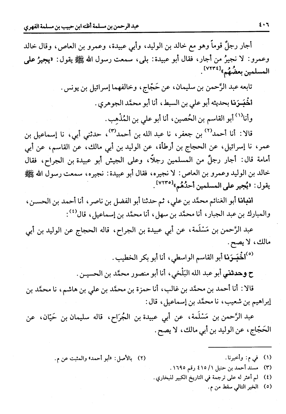 [7235] أنبأنا أبو الغنائم محمد بن علي ثم حدثنا أبو الفضل بن ناصر انا أحمد بن الحسن والمبارك بن عبد الجبار أنا محمد بن سهل انا محمد بن اسماعيل قال (4) : عبد الرحمن بن مسلمة عن أبي عبيدة بن الجراح قاله الحجاج عن الوليد بن أبي مالك لا يصح (5) أخبرنا أبو القاسم الواسطي أنا أبو بكر الخطيب ح وحدثني أبو عبد الله البلخي انا أبو منصور محمد بن الحسين قالا انا أحمد بن محمد بن غالب انا حمزة بن محمد بن علي بن هاشم نا محمد بن ابراهيم بن شعيب نا محمد بن اسماعيل قال عبد الرحمن بن مسلمة عن أبي عبيدة بن الجراح قاله سليمان بن حيان عن الحجاج عن الوليد بن ابي مالك لا يصح