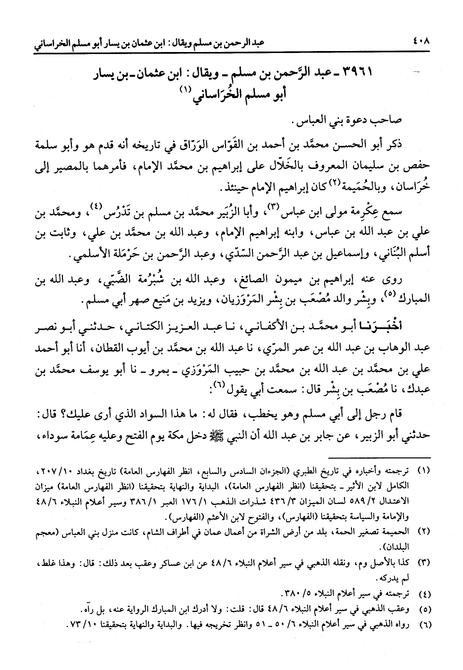 3961 - عبد الرحمن بن مسلم ويقال ابن عثمان بن يسار أبو مسلم الخراساني (1) صاحب دعوة بني العباس ذكر أبو الحسن محمد بن احمد بن القواس الوراق في تاريخه انه قدم هو وأبو سلمة حفص بن سليمان المعروف بالخلال على ابراهيم بن محمد الامام فأمرهما بالمصير الى خراسان وبالحميمة (2) كان ابراهيم الامام حينئذ سمع عكرمة مولى ابن عباس (3) وأبا الزبير محمد بن مسلم بن تدرس (4) ومحمد بن علي بن عبد الله بن عباس وابنه ابراهيم الامام وعبد الله بن محمد بن علي وثابت بن أسلم البناني واسماعيل بن عبد الرحمن السدي وعبد الرحمن بن حرملة الأسلمي روى عنه ابراهيم بن ميمون الصائغ وعبد الله بن شبرمة الضبي وعبد الله بن المبارك (5) وبشر والد مصعب بن بشر المروزيان ويزيد بن منيع صهر أبي مسلم اخبرنا أبو محمد بن الأكفاني نا عبد العزيز الكتاني حدثني أبو نصر عبد الوهاب بن عبد الله بن عمر المري نا عبد الله بن محمد بن أيوب القطان انا أبو أحمد علي بن محمد بن عبد الله بن محمد بن حبيب المروزي بمرو نا أبو يوسف محمد بن عبدك نا مصعب بن بشر قال سمعت أبي يقول (6) قام رجل الى أبي مسلم وهو يخطب فقال له ما هذا السواد الذي أرى عليك قال حدثني أبو الزبير عن جابر بن عبد الله ان النبي (صلى الله عليه وسلم) دخل مكة يوم الفتح وعليه عمامة سوداء