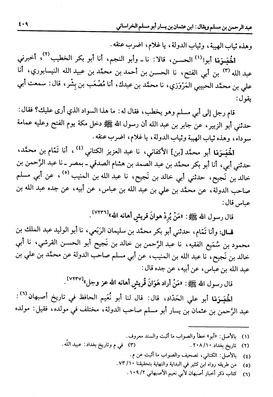 وهذه ثياب الهيبة وثياب الدولة يا غلام اضرب عنقه اخبرنا أبوا (1) الحسن قالا نا وأبو النجم انا أبو بكر الخطيب (2) أخبرني عبد الله (3) بن أبي الفتح نا الحسن بن احمد بن محمد بن عبيد الله النيسابوري انا علي بن محمد الحبيبي المروزي نا محمد بن عبدك انا مصعب بن بشر قال سمعت أبي يقول قام رجل الى أبي مسلم وهو يخطب فقال له ما هذا السواد الذي أرى عليك فقال حدثني أبو الزبير عن جابر بن عبد الله ان سول الله (صلى الله عليه وسلم) دخل مكة يوم الفتح وعليه عمامة سوداء وهذه ثياب الهيبة وثياب الدولة يا غلام اضرب عنقه اخبرنا أبو محمد بن الأكفاني نا عبد العزيز الكتاني (4) انا تمام بن محمد حدثني أبي انا أبو بكر محمد بن عبد الصمد بن هشام الصدقي بمصر نا عبد الرحمن بن خالد بن نجيح حدثني أبي خالد بن نجيح نا عبد الله بن المنيب (5) عن أبي مسلم صاحب الدولة عن محمد بن علي بن عبد الله بن عباس عن أبيه عن جده عبد الله بن عباس قال قال رسول الله صلى الله عليه وسلم من يرد هوان قريش أهانه الله