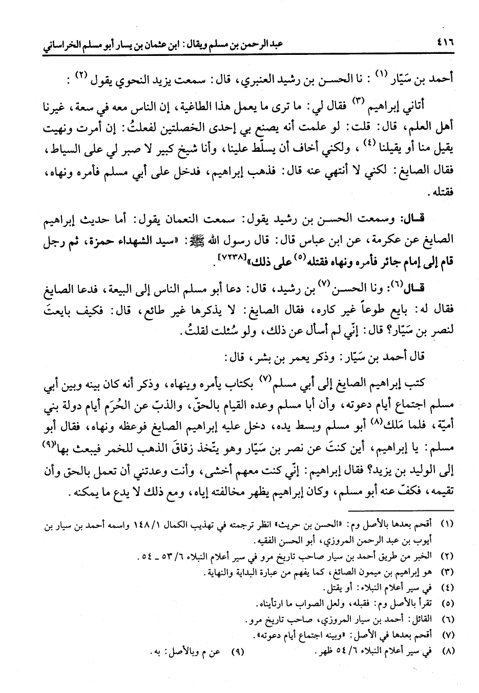 احمد بن سيار (1) نا الحسن بن رشيد العنبري قال سمعت يزيد النحوي يقول (2) أتاني ابراهيم (3) فقال لي ما ترى ما يعمل هذا الطاغية ان الناس معه في سعة غيرنا أهل العلم قال قلت لو علمت أنه يصنع بي احدى الخصلتين لفعلت ان أمرت ونهيت يقيل منا أو يقيلنا (4) ولكني أخاف أن يسلط علينا وأنا شيخ كبير لا صبر لي على السياط فقال الصايغ لكني لا أنتهي عنه قال فذهب ابراهيم فدخل على ابي مسلم فأمره ونهاه فقتله قال وسمعت الحسن بن رشيد يقول سمعت النعمان يقول اما حديث ابراهيم الصايغ عن عكرمة عن ابن عباس قال قال رسول الله (صلى الله عليه وسلم) سيد الشهداء حمزة ثم رجل قام الى امام جائر فأمره ونهاه فقتله (5) على ذلك