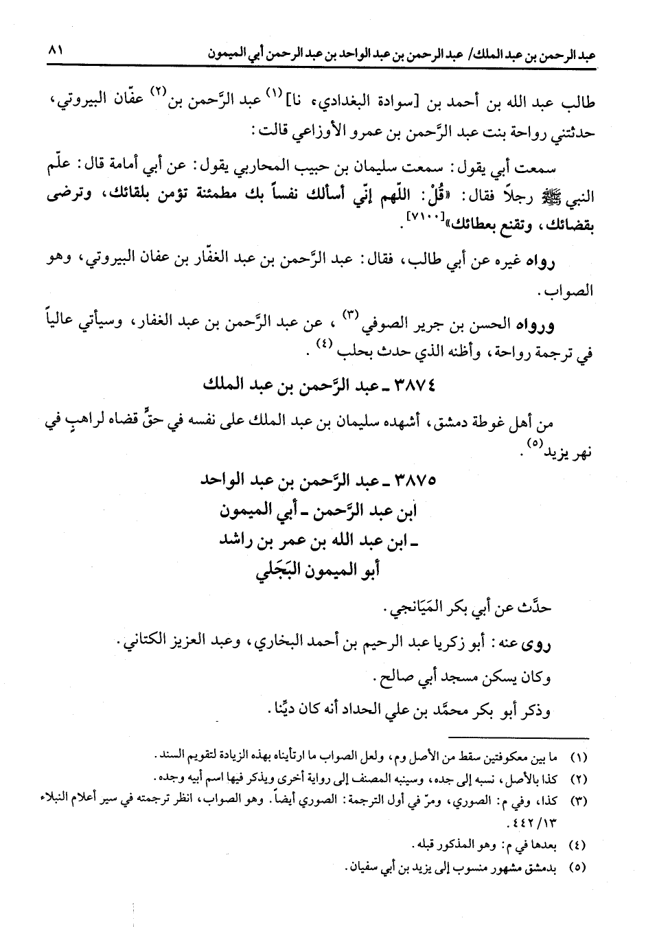 [7100] رواه غيره عن أبي طالب فقال عبد الرحمن بن عبد الغفار بن عفان البيروتي وهو الصواب ورواه الحسن بن جرير الصوفي (3) عن عبد الرحمن بن عبد الغفار وسيأتي عاليا في ترجمة رواحة وأظنه الذي حدث بحلب (4) 3874 - عبد الرحمن بن عبد الملك من أهل غوطة دمشق أشهده سليمان بن عبد الملك على نفسه في حق قضاه لراهب في نهر يزيد (5) 3875 - عبد الرحمن بن عبد الواحد ابن عبد الرحمن أبي الميمون ابن عبد الله بن عمر بن راشد أبو الميمون البجلي حدث عن أبي بكر الميانجي روى عنه أبو زكريا عبد الرحيم بن أحمد البخاري وعبد العزيز الكتاني وكان يسكن مسجد أبي صالح وذكر أبو بكر محمد بن علي الحداد انه كان دينا