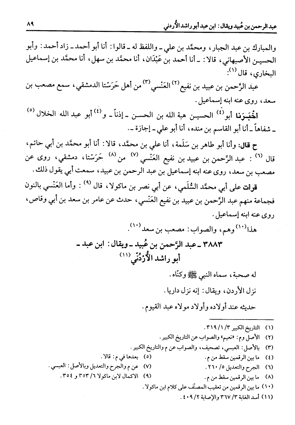 والمبارك بن عبد الجبار ومحمد بن علي واللفظ له قالوا أنا أبو أحمد زاد أحمد وأبو الحسين الأصبهاني قالا أنا أحمد بن عبدان أنا محمد بن سهل أنا محمد بن اسماعيل البخاري قال (1) : عبد الرحمن بن عبيد بن نفيع (2) العنسي (3) من أهل حرستا الدمشقي سمع مصعب بن سعد روى عنه ابنه اسماعيل أخبرنا أبو (4) الحسين هبة الله بن الحسن اذنا و (4) أبو عبد الله الخلال (5) شفاها أنا أبو القاسم بن منده أنا أبو علي اجازة ح قال وأنا أبو طاهر بن سلمة أنا علي بن محمد قالا أنا أبو محمد بن أبي حاتم قال (6) عبد الرحمن بن عبيد بن نفيع العنسي (7) من (8) حرستا دمشقي روى عن مصعب بن سعد روى عنه ابنه اسماعيل بن عبد الرحمن بن عبيد سمعت أبي يقول ذلك قرأت على أبي محمد السلمي عن أبي نصر بن ماكولا قال (9) وأما العنسي بالنون فجماعة منهم عبد الرحمن بن عبيد بن نفيع العنسي حدث عن عامر بن سعد بن أبي وقاص روى عنه ابنه اسماعيل هذا (10) وهم والصواب مصعب بن سعد (10) 3883 - عبد الرحمن بن عبيد ويقال ابن عبد أبو راشد الأردني (11) له صحبة سماه النبي (صلى الله عليه وسلم) وكناه نزل الاردن ويقال انه نزل داريا حديثه عند أولاده وأولاد مولاه عبد القيوم