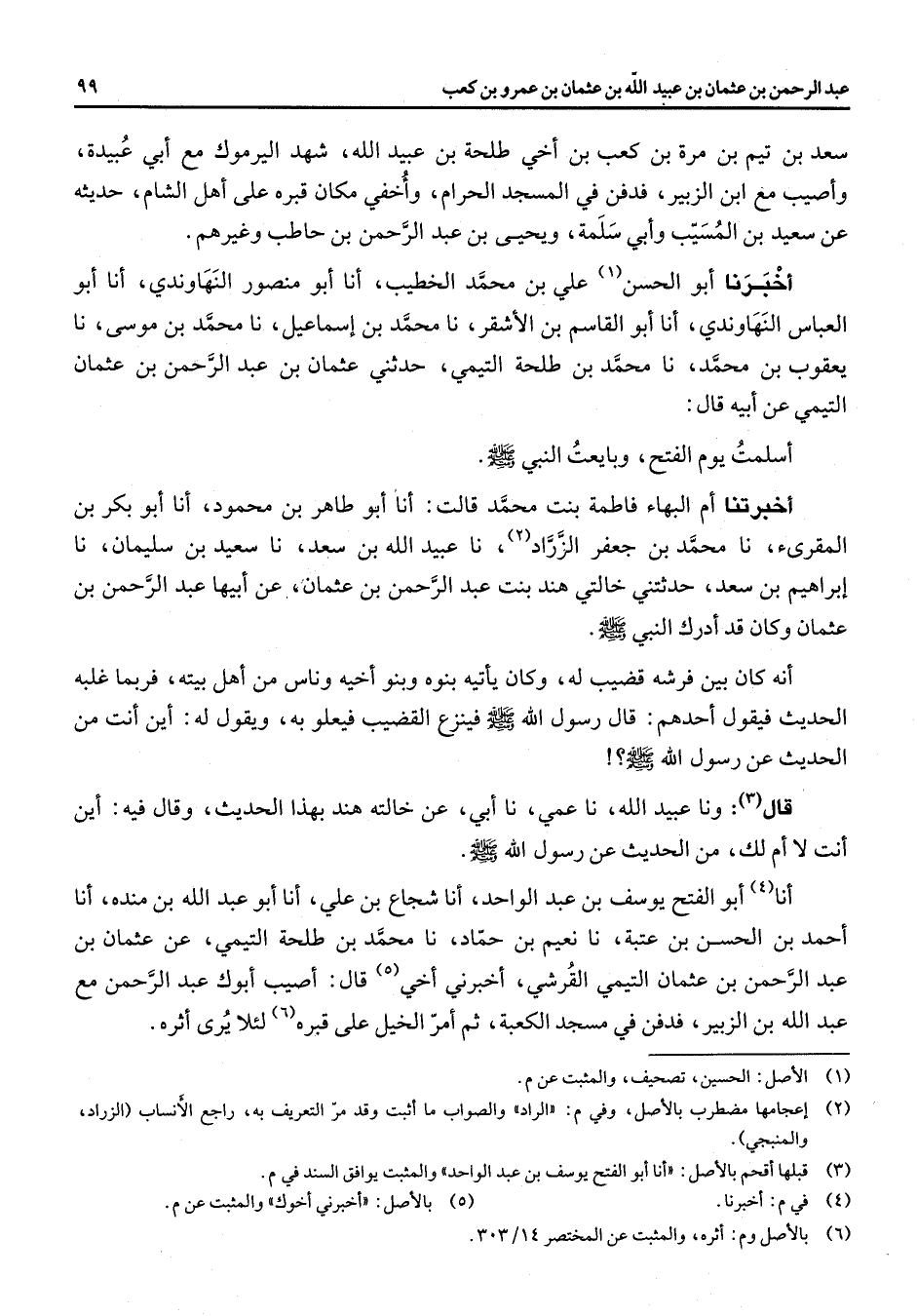 سعد بن تيم بن مرة بن كعب بن أخي طلحة بن عبيد الله شهد اليرموك مع أبي عبيدة وأصيب مع ابن الزبير فدفن في المسجد الحرام وأخفي مكان قبره على أهل الشام حديثه عن سعيد بن المسيب وأبي سلمة ويحيى بن عبد الرحمن بن حاطب وغيرهم أخبرنا أبو الحسن (1) علي بن محمد الخطيب أنا أبو منصور النهاوندي أنا أبو العباس النهاوندي أنا أبو القاسم بن الأشقر نا محمد بن اسماعيل نا محمد بن موسى نا يعقوب بن محمد نا محمد بن طلحة التيمي حدثني عثمان بن عبد الرحمن بن عثمان التيميى عن أبيه قال أسلمت يوم الفتح وبايعت النبي (صلى الله عليه وسلم) أخبرتنا أم البهاء فاطمة بنت محمد قالت أنا أبو طاهر بن محمود أنا أبو بكر بن المقرئ نا محمد بن جعفر الزراد (2) نا عبيد الله بن سعد نا سعيد بن سليمان نا إبراهيم بن سعد حدثتني خالتي هند بنت عبد الرحمن بن عثمان عن أبيها عبد الرحمن بن عثمان وكان قد أدرك النبي (صلى الله عليه وسلم) أنه كان بين فرشه قضيب له وكان يأتيه بنوه وبنو أخيه وناس من أهل بيته فربما غلبه الحديث فيقول أحدهم قال رسول الله (صلى الله عليه وسلم) فينزع القضيب فيعلو به ويقول له أين أنت من الحديث عن رسول الله (صلى الله عليه وسلم) قال (3) ونا عبيد الله نا عمي نا أبي عن خالته هند بهذا الحديث وقال فيه أين انت لا أم لك من الحديث عن رسول الله (صلى الله عليه وسلم) أنا (4) أبو الفتح يوسف بن عبد الواحد أنا شجاع بن علي أنا أبو عبد الله بن منده أنا أحمد بن الحسن بن عتبة نا نعيم بن حماد نا محمد بن طلحة التيمي عن عثمان بن عبد الرحمن بن عثمان التيمي القرشي أخبرني أخي (5) قال أصيب أبوك عبد الرحمن مع عبد الله بن الزبير فدفن في مسجد الكعبة ثم أمر الخيل على قبره (6) لئلا يرى أثره