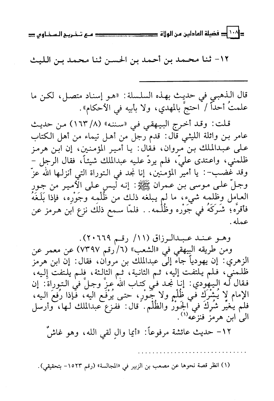 12 - ثنا مُحَمَّدُ بْنُ أَحْمَدَ بْنِ الْحَسَنِ، ثنا مُحَمَّدُ بْنُ اللَّيْثِ -[109]- الْجَوْهَرِيُّ، ثنا شُعَيْبُ بْنُ سَلَمَةَ، ثنا عِصْمَةُ بْنُ مُحَمَّدٍ، ثنا مُوسَى بْنُ عُقْبَةَ، عَنِ الْقَاسِمِ بْنِ مُحَمَّدٍ، عَنْ عَائِشَةَ، قَالَتْ: سَمِعْتُ رَسُولَ اللَّهِ صَلَّى اللهُ عَلَيْهِ وَسَلَّمَ يَقُولُ: §«أَيُّمَا وَالٍ لَقِيَ اللَّهَ وَهُوَ غَاشٌّ لِرَعِيَّتِهِ حَرَّمَ اللَّهُ عَلَيْهِ أَنْ يَدْخُلَ الْجَنَّةَ» قَالَ أَبُو نُعَيْمٍ: وَتَقْرِيرُ الْجَاهِلِينَ وَالْجَائِرِينَ فِي تَوْلِيَتِهِمْ بَعْدَ الْوُقُوفِ عَلَيْهِمْ أَعْظَمُ الْغِشِّ، وَالْوَالِي إِذَا أَنْصَفَ الضَّعِيفَ مِنَ الْقَوِيِّ رَافَقَ النَّبِيِّينَ فِي أَعْلَى عِلِّيِّينَ