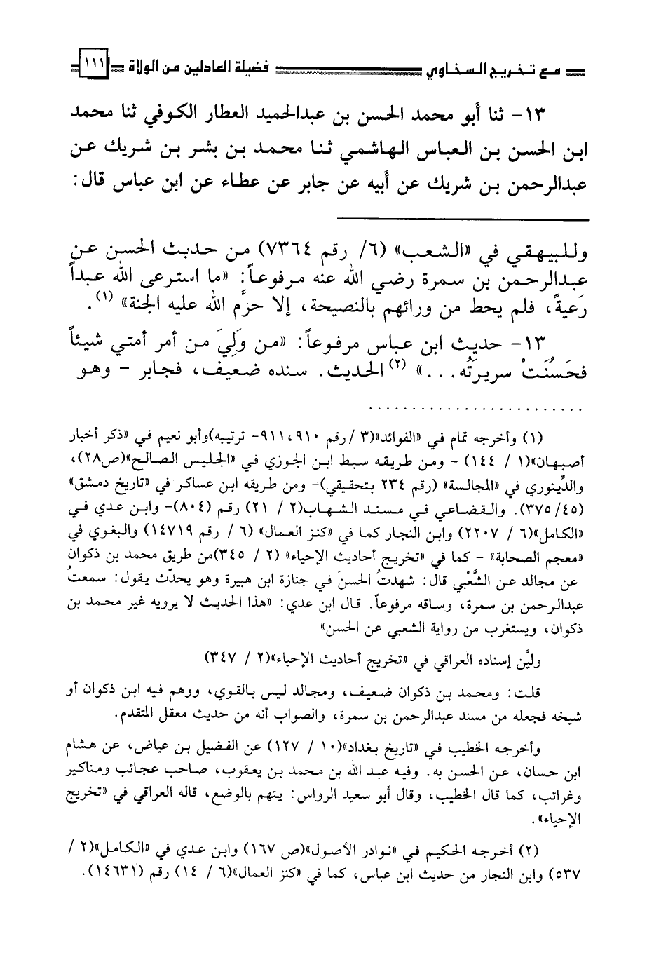 13 - ثنا أَبُو مُحَمَّدٍ الْحَسَنُ بْنُ عَبْدِ الْحَمِيدِ الْعَطَّارُ الْكُوفِيُّ، ثنا مُحَمَّدُ بْنُ الْحَسَنِ بْنِ الْعَبَّاسِ الْهَاشِمِيُّ، ثنا مُحَمَّدُ بْنُ بِشْرِ بْنِ شَرِيكٍ، عَنْ عَبْدِ الرَّحْمَنِ بْنِ شَرِيكٍ، عَنْ أَبِيهِ، عَنْ جَابِرٍ، عَنْ عَطَاءٍ، عَنِ ابْنِ عَبَّاسٍ، قَالَ -[112]-: قَالَ رَسُولُ اللَّهِ صَلَّى اللهُ عَلَيْهِ وَسَلَّمَ: §«مَنْ وَلِيَ مِنْ أَمْرِ أُمَّتِي شَيْئًا فَحَسُنَتْ سَرِيرَتُهُ رُزِقَ الْهَيْبَةَ، وَإِذَا بَسَطَ يَدَهُ بِالْمَعْرُوفِ رُزِقَ الْمَحَبَّةَ، وَإِذَا عَدَلَ زِيدَ فِي عُمُرِهِ، وَإِذَا أَنْصَفَ الضَّعِيفَ مِنَ الْقَوِيِّ كَانَ مَعِي فِي الْجَنَّةِ» ، وَأَشَارَ بِأُصْبُعَيْهِ السَّبَّابَةِ -[113]- وَالْوُسْطَى
