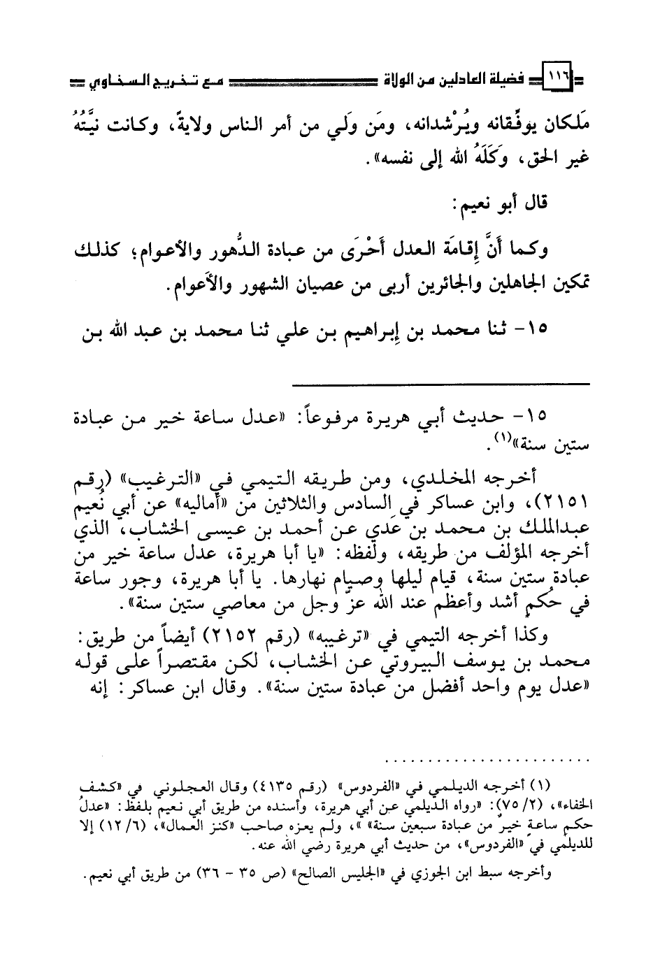 15 - ثنا مُحَمَّدُ بْنُ إِبْرَاهِيمَ بْنِ عَلِيٍّ، ثنا مُحَمَّدُ بْنُ عَبْدِ اللَّهِ بْنِ -[117]- عَبْدِ السَّلَامِ، قَالَ: ثنا أَحْمَدُ بْنُ عِيسَى بْنِ يَزِيدَ، ثنا عَمْرُو بْنُ أَبِي سَلَمَةَ، ثنا إِبْرَاهِيمُ بْنُ مُحَمَّدٍ الْأَنْصَارِيُّ، عَنْ عَلِيِّ بْنِ ثَابِتٍ، عَنْ مُحَمَّدِ بْنِ سِيرِينَ، عَنْ أَبِي هُرَيْرَةَ، قَالَ: قَالَ رَسُولُ اللَّهِ صَلَّى اللهُ عَلَيْهِ وَسَلَّمَ: «§عَدْلُ سَاعَةٍ خَيْرٌ مِنْ عِبَادَةِ سِتِّينَ سَنَةً، قِيَامَ لَيْلِهَا، وَصِيَامَ نَهَارِهَا، وَجَوْرُ سَاعَةٍ فِي حُكْمٍ أَشَدُّ وَأَعْظَمُ مِنْ مَعْصِيَةِ سِتِّينَ سَنَةً»