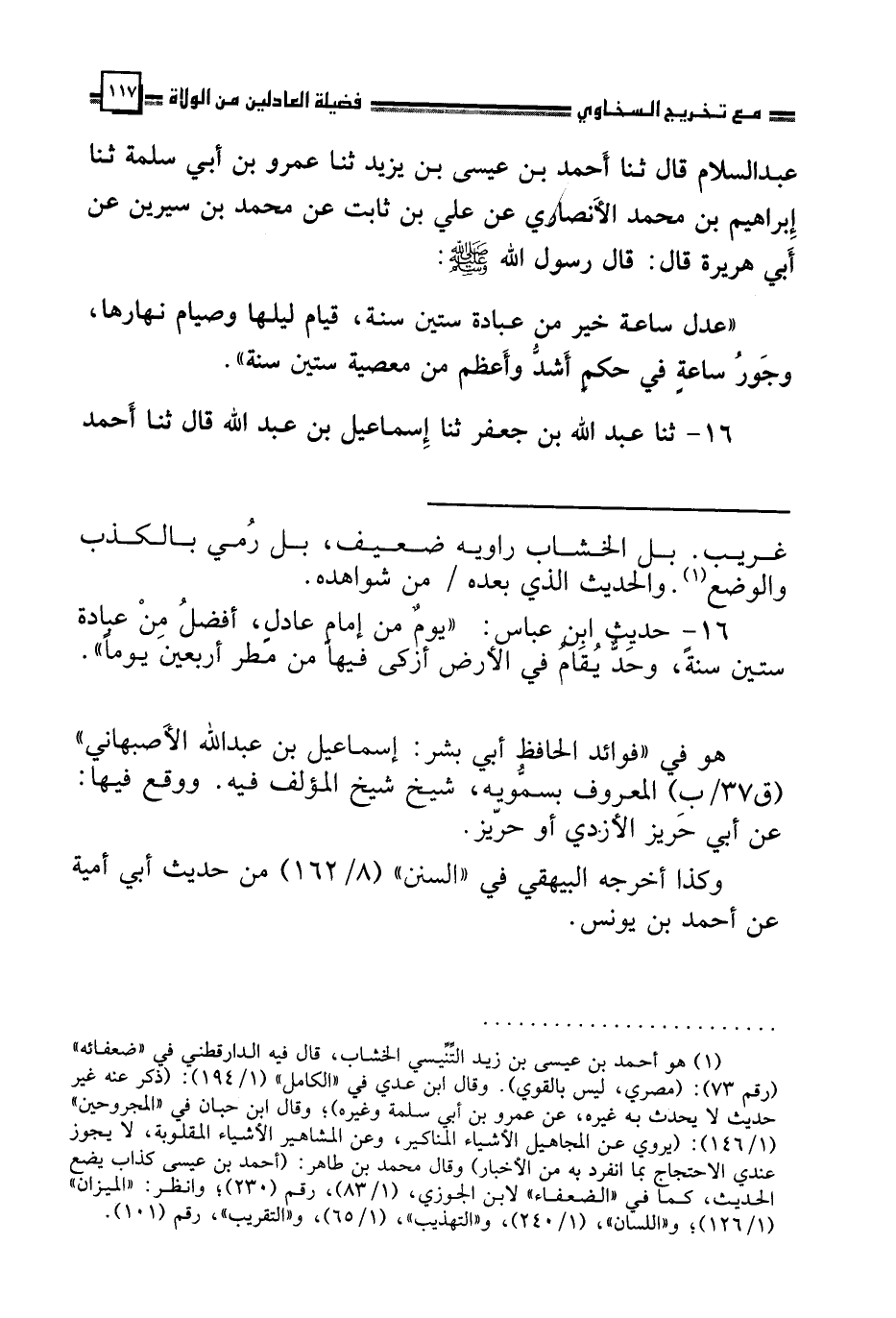 16 - ثنا عَبْدُ اللَّهِ بْنُ جَعْفَرٍ، ثنا إِسْمَاعِيلُ بْنُ عَبْدِ اللَّهِ، قَالَ: ثنا أَحْمَدُ -[118]- بْنُ يُونُسَ، ثنا سَعْدٌ أَبُو غَيْلَانَ الشَّيْبَانِيُّ، ثنا عَفَّانُ بْنُ جُبَيْرٍ الطَّائِيُّ، عَنْ أَبِي حَرِيزٍ الْأَزْدِيِّ، عَنْ عِكْرِمَةَ، عَنِ ابْنِ عَبَّاسٍ، قَالَ: قَالَ رَسُولُ اللَّهِ صَلَّى اللهُ عَلَيْهِ وَسَلَّمَ -[119]-: «§يَوْمٌ مِنْ إِمَامٍ عَادِلٍ أَفْضَلُ مِنْ عِبَادَةِ سِتِّينَ سَنَةً، وَحَدٌّ يُقَامُ فِي الْأَرْضِ أَزْكَى فِيهَا مِنْ قَطْرِ أَرْبَعِينَ يَوْمًا»
