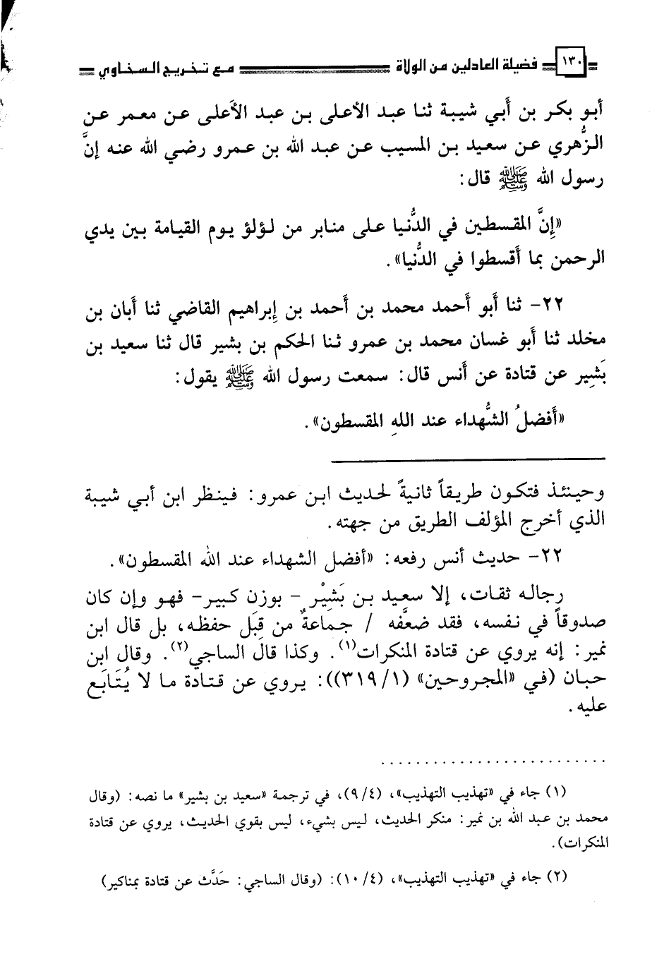 22 - ثنا أَبُو أَحْمَدَ مُحَمَّدُ بْنُ أَحْمَدَ بْنِ إِبْرَاهِيمَ الْقَاضِي، ثنا أَبَانُ بْنُ مَخْلَدٍ، ثنا أَبُو غَسَّانَ مُحَمَّدُ بْنُ عَمْرٍو، ثنا الْحَكَمُ بْنُ بَشِيرٍ، قَالَ: ثنا سَعِيدُ بْنُ بَشِيرٍ، عَنْ قَتَادَةَ، عَنْ أَنَسٍ، قَالَ: سَمِعْتُ رَسُولَ اللَّهِ صَلَّى اللهُ عَلَيْهِ وَسَلَّمَ يَقُولُ: §«أَفْضَلُ الشُّهَدَاءِ عِنْدَ اللَّهِ الْمُقْسِطُونَ»