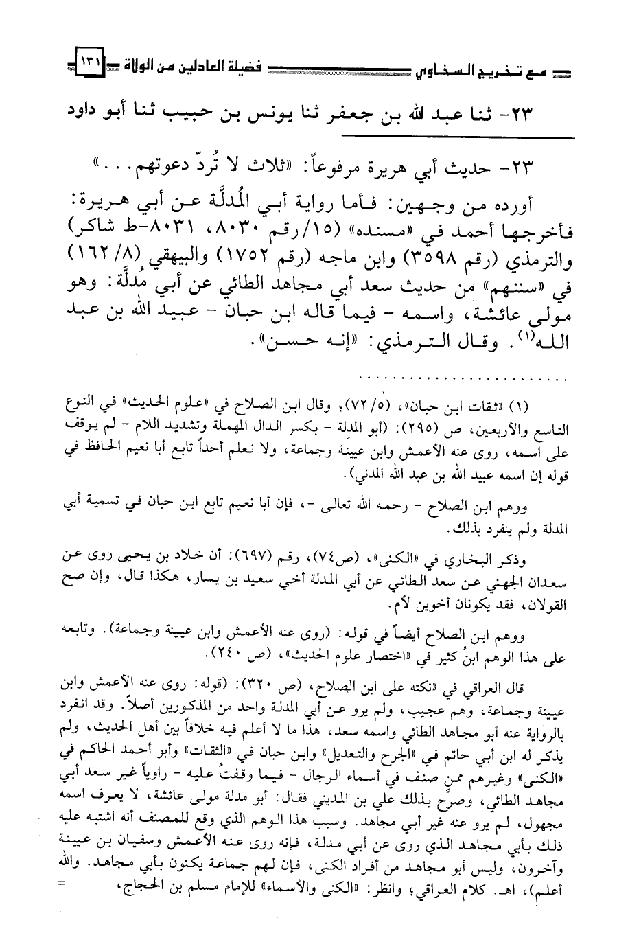 23 - ثنا عَبْدُ اللَّهِ بْنُ جَعْفَرٍ، ثنا يُونُسُ بْنُ حَبِيبٍ، ثنا أَبُو دَاوُدَ الطَّيَالِسِيُّ، وَثَنًا أَبُو بَكْرِ بْنُ خَلَّادٍ، ثنا الْحَارِثُ بْنُ أَبِي أُسَامَةَ، ثنا عَاصِمُ بْنُ عَلِيٍّ، قَالَا: ثنا زُهَيْرٌ أَبُو خَيْثَمَةَ، قَالَ: ثنا سَعْدٌ الطَّائِيُّ، ثنا أَبُو الْمُدِلَّةَ، أَنَّهُ سَمِعَ أَبَا هُرَيْرَةَ، يَقُولُ: قَالَ رَسُولُ اللَّهِ صَلَّى اللهُ عَلَيْهِ وَسَلَّمَ: " §ثَلَاثَةٌ لَا تُرَدُّ دَعْوَتُهُمُ: الْإِمَامُ الْعَادِلُ، وَالصَّائِمُ حَتَّى يُفْطِرَ، وَدَعْوَةُ الْمَظْلُومِ تُحْمَلُ عَلَى الْغَمَامِ، وَتُفْتَحُ لَهَا أَبْوَابُ السَّمَاءِ، وَيَقُولُ الرَّبُّ: وَعِزَّتِي لَأَنْصُرَنَّكَ وَلَوْ بَعْدَ حِينٍ "