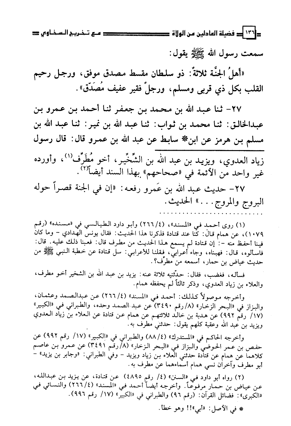 27 - ثنا عَبْدُ اللَّهِ بْنُ مُحَمَّدِ بْنِ جَعْفَرٍ، ثنا أَحْمَدُ بْنُ عَمْرِو بْنِ عَبْدِ الْخَالِقِ، ثنا مُحَمَّدُ بْنُ ثَوَابٍ، ثنا عَبْدُ اللَّهِ بْنُ نُمَيْرٍ، ثنا عَبْدُ اللَّهِ بْنُ مُسْلِمِ بْنِ هُرْمُزٍ، عَنِ ابْنِ سَابِطٍ، عَنْ عَبْدِ اللَّهِ بْنِ عَمْرٍو، قَالَ: قَالَ رَسُولُ اللَّهِ صَلَّى اللهُ عَلَيْهِ وَسَلَّمَ -[137]-: «إِنَّ §فِي الْجَنَّةِ قَصْرًا، حَوْلَهُ الْبُرُوجُ وَالْمُرُوجُ، لَهُ خَمْسَةُ آلَافِ بَابٍ، لَا يَدْخُلُهُ أَوْ لَا يَسْكُنُهُ إِلَّا نَبِيٌّ أَوْ صِدِّيقٌ أَوْ شَهِيدٌ أَوْ إِمَامٌ عَادِلٌ»