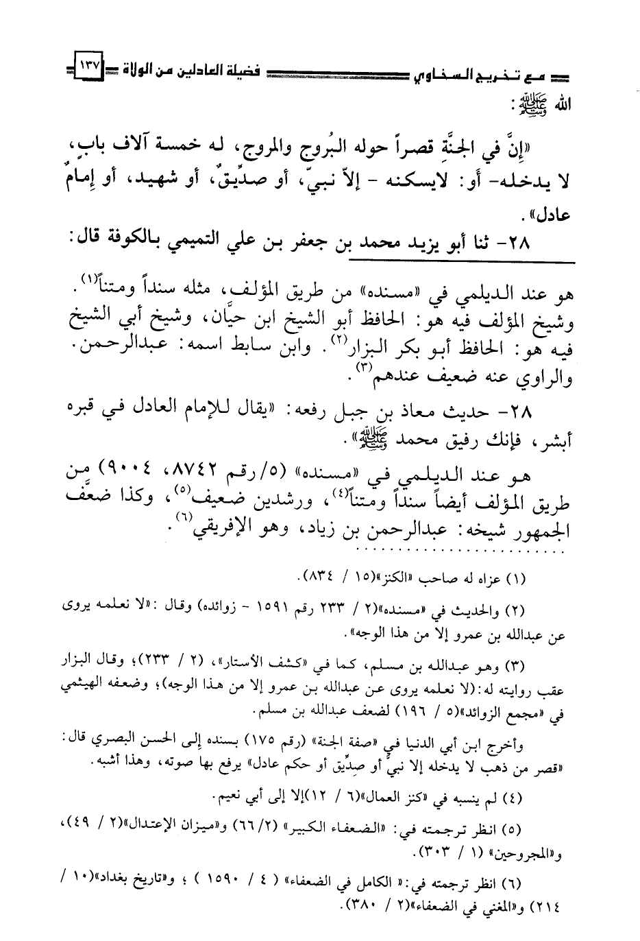 28 - ثنا أَبُو يَزِيدَ مُحَمَّدُ بْنُ جَعْفَرِ بْنِ عَلِيٍّ التَّمِيمِيُّ بِالْكُوفَةِ قَالَ: ثنا سُمَيْعُ بْنُ إِسْحَاقَ، ثنا أَبُو كُرَيْبٍ، ثنا رِشْدِينُ بْنُ سَعْدٍ، عَنْ عَبْدِ الرَّحْمَنِ بْنِ زِيَادٍ، عَنْ عُتْبَةَ بْنِ حُمَيْدٍ، عَنْ عُبَادَةَ بْنِ نُسَيٍّ، عَنْ عَبْدِ الرَّحْمَنِ بْنِ غَنْمٍ، عَنْ مُعَاذِ بْنِ جَبَلٍ، قَالَ: قَالَ رَسُولُ اللَّهِ صَلَّى اللهُ عَلَيْهِ وَسَلَّمَ: " §يُقَالُ لِلْإِمَامِ الْعَادِلِ فِي قَبْرِهِ: أَبْشِرْ، فَإِنَّكَ رَفِيقُ مُحَمَّدٍ صَلَّى اللهُ عَلَيْهِ وَسَلَّمَ " قَالَ أَبُو نُعَيْمٍ: وَمِنْ سَعَادَةِ الْوُلَاةِ وَالْأُمَرَاءِ أَنْ يُقَيَّضَ لَهُمُ الصُّلَحَاءُ مِنَ الْوُزَرَاءِ
