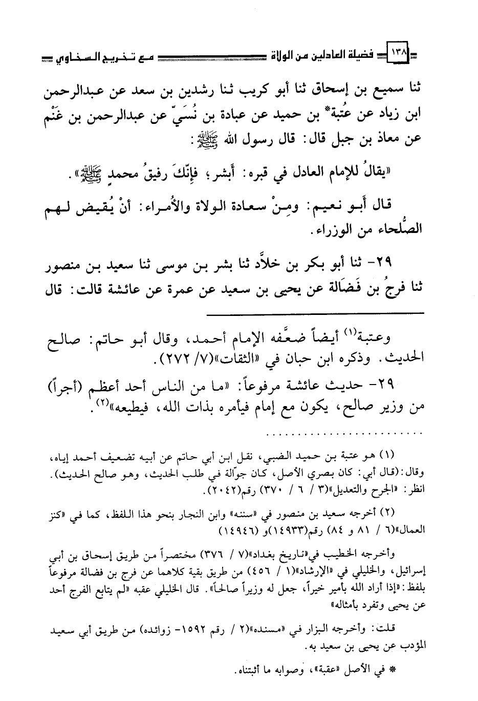 29 - ثنا أَبُو بَكْرِ بْنُ خَلَّادٍ، ثنا بِشْرُ بْنُ مُوسَى، ثنا سَعِيدُ بْنُ مَنْصُورٍ، ثنا فَرَّجُ بْنُ فَضَالَةَ، عَنْ يَحْيَى بْنِ سَعِيدٍ، عَنْ عَمْرَةَ، عَنْ عَائِشَةَ، قَالَتْ: قَالَ رَسُولُ اللَّهِ صَلَّى اللهُ عَلَيْهِ وَسَلَّمَ: §«مَا مِنَ النَّاسِ أَحَدٌ أَعْظَمَ أَجْرًا مِنْ وَزِيرٍ صَالِحٍ يَكُونُ مَعَ إِمَامٍ فَيَأْمُرَهُ بِذَاتِ اللَّهِ فَيُطِيعُهُ»