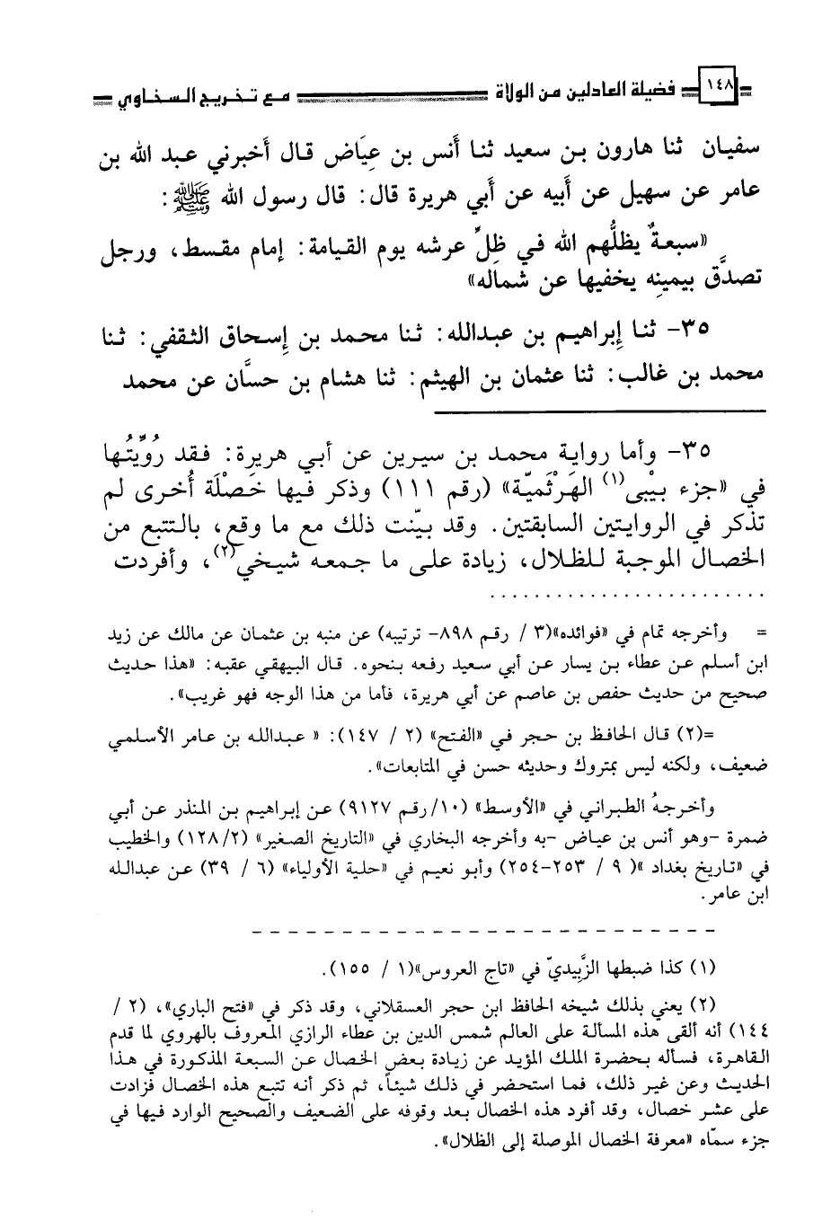 35 - ثنا إِبْرَاهِيمُ بْنُ عَبْدِ اللَّهِ، ثنا مُحَمَّدُ بْنُ إِسْحَاقَ الثَّقَفِيُّ، ثنا مُحَمَّدُ بْنُ غَالِبٍ، ثنا عُثْمَانُ بْنُ الْهَيْثَمِ، ثنا هِشَامُ بْنُ حَسَّانَ، عَنْ مُحَمَّدِ بْنِ سِيرِينَ، عَنْ أَبِي هُرَيْرَةَ، قَالَ: قَالَ رَسُولُ اللَّهِ صَلَّى اللهُ عَلَيْهِ وَسَلَّمَ: " §سَبْعَةٌ فِي ظِلِّ الْعَرْشِ يَوْمَ لَا ظِلَّ إِلَّا ظِلُّهُ: إِمَامٌ مُقْسِطٌ وَرَجُلٌ دَعَتْهُ امْرَأَةٌ ذَاتُ حَسَبٍ وَجَمَالٍ إِلَى نَفْسِهَا فَقَالَ: إِنِّي أَخَافُ اللَّهَ رَبَّ الْعَالَمِينَ " قَالَ أَبُو نُعَيْمٍ: وَصَلَاحُ الرَّاعِي صَلَاحُ الرَّعِيَّةِ، وَفِي إِغْفَالِهِمْ وَتَقْوِيمِهِمُ الدَّمَارُ وَالْبَلِيَّةُ