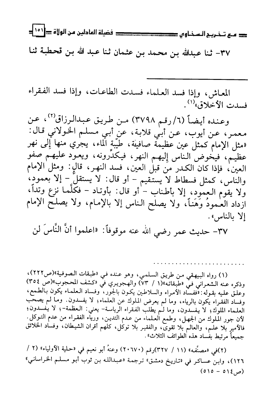 37 - ثنا عَبْدُ اللَّهِ بْنُ مُحَمَّدِ بْنِ عُثْمَانَ، ثنا عَبْدُ اللَّهِ بْنُ قَحْطَبَةَ، ثنا عَبَّاسُ بْنُ عَبْدِ الْعَظِيمِ الْعَنْبَرِيُّ، قَالَ: حَدَّثَنِي الْفَضْلُ بْنُ دُكَيْنٍ، عَنْ مَالِكِ بْنِ أَنَسٍ، عَنْ زَيْدِ بْنِ أَسْلَمَ، عَنْ أَبِيهِ، قَالَ: قَالَ عُمَرُ بْنُ الْخَطَّابِ عِنْدَ مَوْتِهِ: «اعْلَمُوا أَنَّ النَّاسَ، §لَنْ يَزَالُوا بِخَيْرٍ مَا اسْتَقَامَتْ لَهُمْ وُلَاتُهُمْ وَهُدَاتُهُمْ»