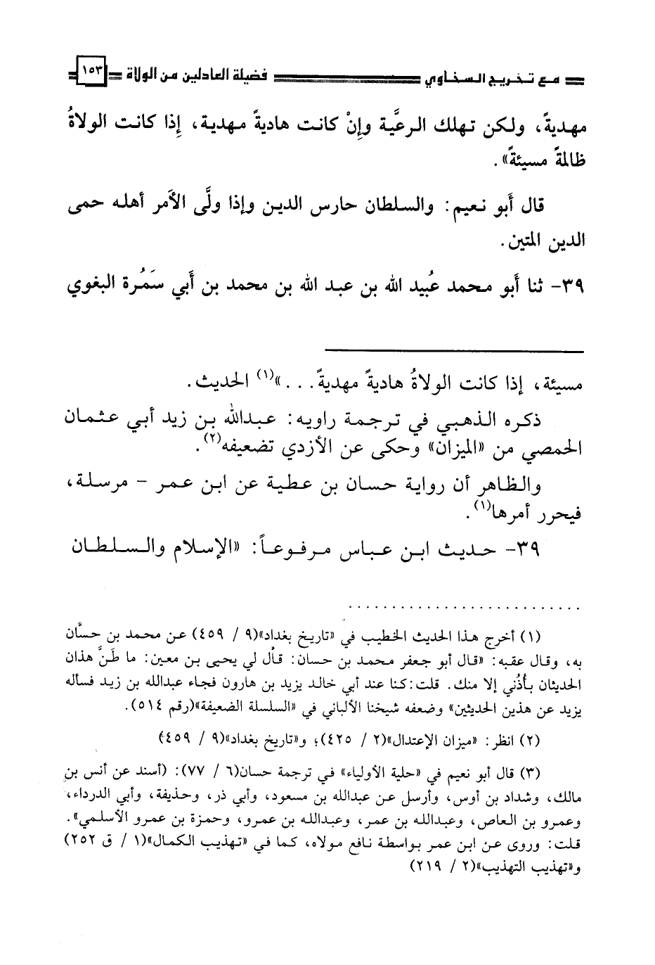 39 - ثنا أَبُو مُحَمَّدٍ عُبَيْدُ اللَّهِ بْنُ عَبْدِ اللَّهِ بْنِ مُحَمَّدِ بْنِ أَبِي سَمُرَةَ الْبَغَوِيُّ، ثنا عَبْدُ اللَّهِ بْنُ الْحَسَنِ بْنِ نَصْرٍ الْوَاسِطِيُّ، ثنا سَوَادَةُ بْنُ عَلِيٍّ الْكُوفِيُّ، قَالَ: ثنا عَلِيُّ بْنُ مِكْنَفِ بْنِ حَاجِبٍ التَّمِيمِيُّ، ثنا طِلَابُ بْنُ حَوْشَبٍ، عَنْ أَبِي زَيْدٍ، عَنْ أَبِي الْمُغِيرَةِ، عَنِ ابْنِ عَبَّاسٍ، قَالَ: قَالَ رَسُولُ اللَّهِ صَلَّى اللهُ عَلَيْهِ وَسَلَّمَ: «§الْإِسْلَامُ وَالسُّلْطَانُ أَخَوَانِ تَوْأَمٌ، لَا يَصْلُحُ وَاحِدٌ مِنْهُمَا إِلَّا بِصَاحِبِهِ، فَالْإِسْلَامُ أُسُّ وَالسُّلْطَانِ حَارِسٌ، وَمَا لَا أُسَّ لَهُ مُنْهَدِمٌ، وَمَا لَا حَارِسَ لَهُ ضَائِعٌ»