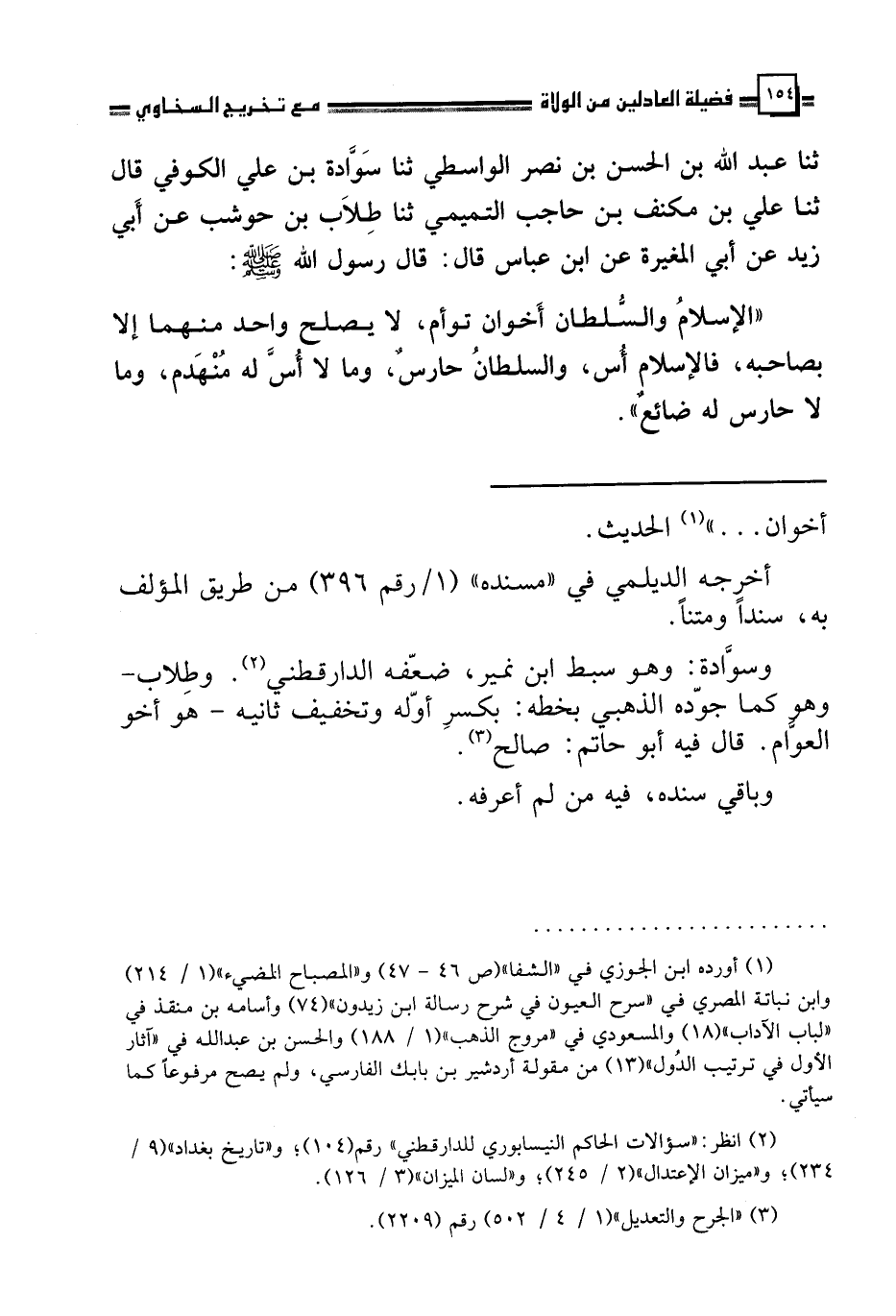 40 - حُدِّثْتُ عَنْ مُحَمَّدِ بْنِ مَأْمُونٍ الْمَرْوَزِيِّ، عَنْ عَوْنِ بْنِ مَنْصُورٍ الْمَرْوَزِيِّ، قَالَ: ثنا مُوسَى بْنُ بَحْرٍ الْكُوفِيُّ، ثنا عَمْرُو بْنُ عَبْدِ الْغَفَّارِ، عَنِ -[156]- الْحَسَنِ بْنِ عَمْرٍو الْفُقَيْمِيِّ، عَنْ سَعِيدِ بْنِ مَعْبَدٍ الْأَنْصَارِيِّ، وَعَبْدِ اللَّهِ بْنِ عَبْدِ الرَّحْمَنِ أَبِي طُوَالَةَ، عَنْ سَالِمِ بْنِ عَبْدِ اللَّهِ بْنِ عُمَرَ، عَنْ أَبِيهِ، عَنْ عُمَرَ بْنِ الْخَطَّابِ، قَالَ: قُلْتُ: يَا رَسُولَ اللَّهِ أَخْبِرْنِي عَنْ هَذَا السُّلْطَانِ الَّذِي، ذَلَّتْ لَهُ الرِّقَابُ وَخَضَعَتْ لَهُ الْأَجْسَادُ، مَا هُوَ؟ قَالَ: «هُوَ §ظِلُّ اللَّهِ فِي الْأَرْضِ، فَإِنْ أَحْسَنُوا فَلَهُمُ الْأَجْرُ وَعَلَيْكُمُ الشُّكْرُ، وَإِنْ أَسَاءُوا فَعَلَيْكُمُ الصَّبْرُ وَعَلَيْهِمُ الْإِصْرُ، لَا تَحْمِلَنَّكُمْ إِسَاءَتُهُ عَلَى أَنْ تَخْرُجُوا مِنْ طَاعَتِهِ، فَإِنَّ الذُّلَّ فِي طَاعَةِ اللَّهِ خَيْرٌ مِنْ خُلُودٍ فِي النَّارِ، لَوْلَاهُمْ مَا صَلَحَ النَّاسُ»