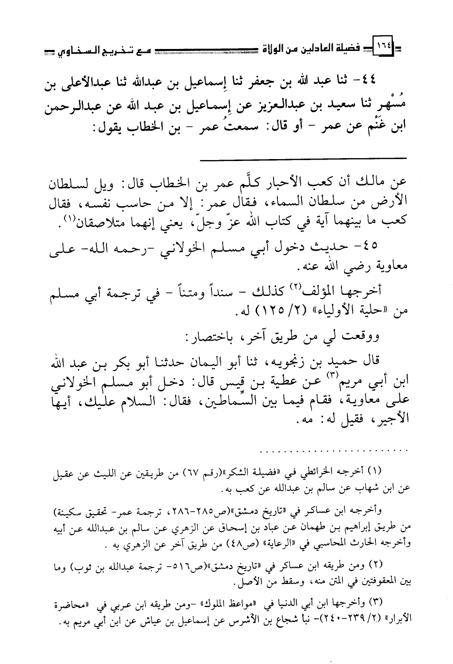 44 - ثنا عَبْدُ اللَّهِ بْنُ جَعْفَرٍ، ثنا إِسْمَاعِيلُ بْنُ عَبْدِ اللَّهِ، ثنا عَبْدُ الْأَعْلَى بْنُ مُسْهِرٍ، ثنا سَعِيدُ بْنُ عَبْدِ الْعَزِيزِ، عَنْ إِسْمَاعِيلَ بْنِ عَبْدِ اللَّهِ، عَنْ عَبْدِ الرَّحْمَنِ بْنِ غَنْمٍ، عَنْ عُمَرَ، أَوْ قَالَ: سَمِعْتُ عُمَرَ بْنَ الْخَطَّابِ، يَقُولُ: §«وَيْلٌ لِدَيَّانِ مَنْ فِي الْأَرْضِ مِنْ دَيَّانِ مَنْ فِي السَّمَاءِ يَوْمَ يَلْقَوْنَهُ إِلَّا مَنْ أَمَرَ بِالْعَدْلِ وَقَضَى بِالْحَقِّ وَلَمْ يَقْضِ عَلَى هَوًى وَلَا عَلَى قَرَابَةٍ، وَلَا عَلَى رَغَبٍ وَلَا رَهَبٍ وَجَعَلَ كِتَابَ اللَّهِ مِرْآةً بَيْنَ عَيْنَيْهِ» قَالَ عَبْدُ الرَّحْمَنِ بْنُ غَنْمٍ: فَحُدِّثْتُ هَذَا عَنْ عُثْمَانَ بْنِ عَفَّانَ، وَمُعَاوِيَةَ، وَيَزِيدَ، وَعَبْدِ الْمَلِكِ