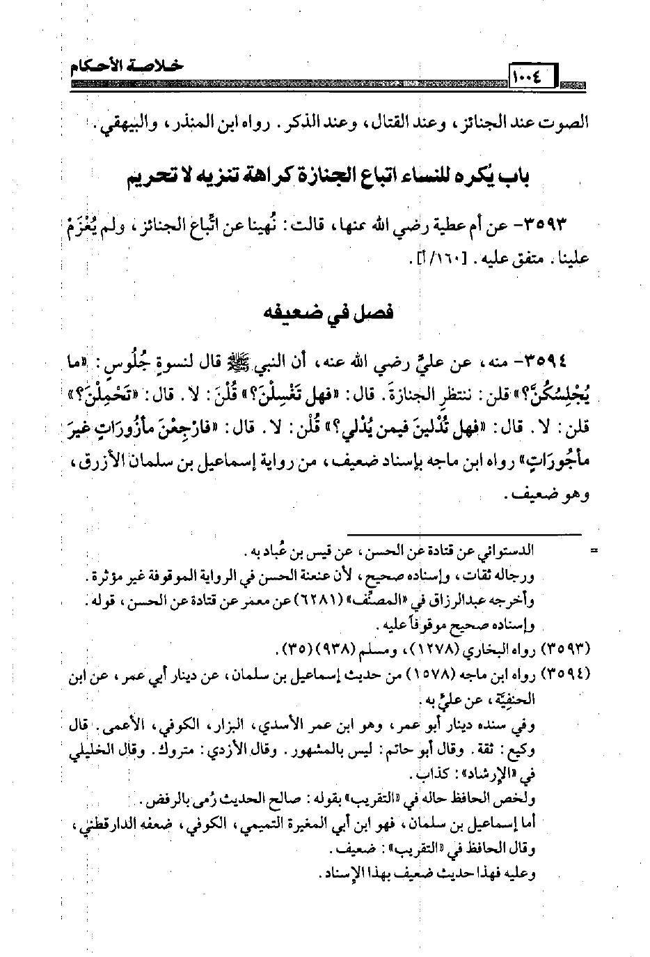 3594 - مِنْهُ، عَن عَلّي رَضِيَ اللَّهُ عَنْه، أَن النَّبِي صَلَّى اللَّهُ عَلَيْهِ وَسَلَّم َ قَالَ لنسوة جُلُوس: " مَا يجلسكن؟ " قُلْنَ: نَنْتَظِر الْجِنَازَة. قَالَ: " فَهَل تغسلن؟ " قُلْنَ: لَا. قَالَ: " تحملن؟ " قُلْنَ: لَا. قَالَ: " فَهَل تدلين فِيمَن يُدْلِي؟ " قُلْنَ: لَا. قَالَ: " فارجعن مَأْزُورَات غير مَأْجُورَات " رَوَاهُ ابْن ماجة بِإِسْنَاد ضَعِيف، من رِوَايَة إِسْمَاعِيل بن سلمَان الْأَزْرَق، وَهُوَ ضَعِيف.