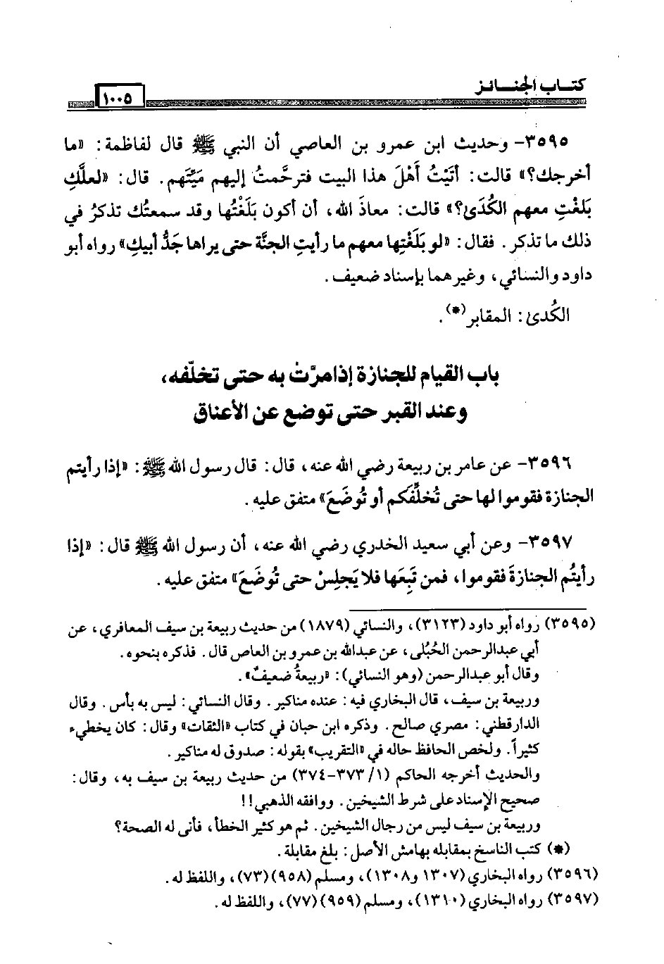 3596 - عَن عَامر بن ربيعَة رَضِيَ اللَّهُ عَنْه، قَالَ: قَالَ رَسُول الله صَلَّى اللَّهُ عَلَيْهِ وَسَلَّم َ: " إِذا رَأَيْتُمْ الْجِنَازَة فَقومُوا لَهَا حَتَّى تخلفكم أَو تُوضَع " مُتَّفق عَلَيْهِ.
