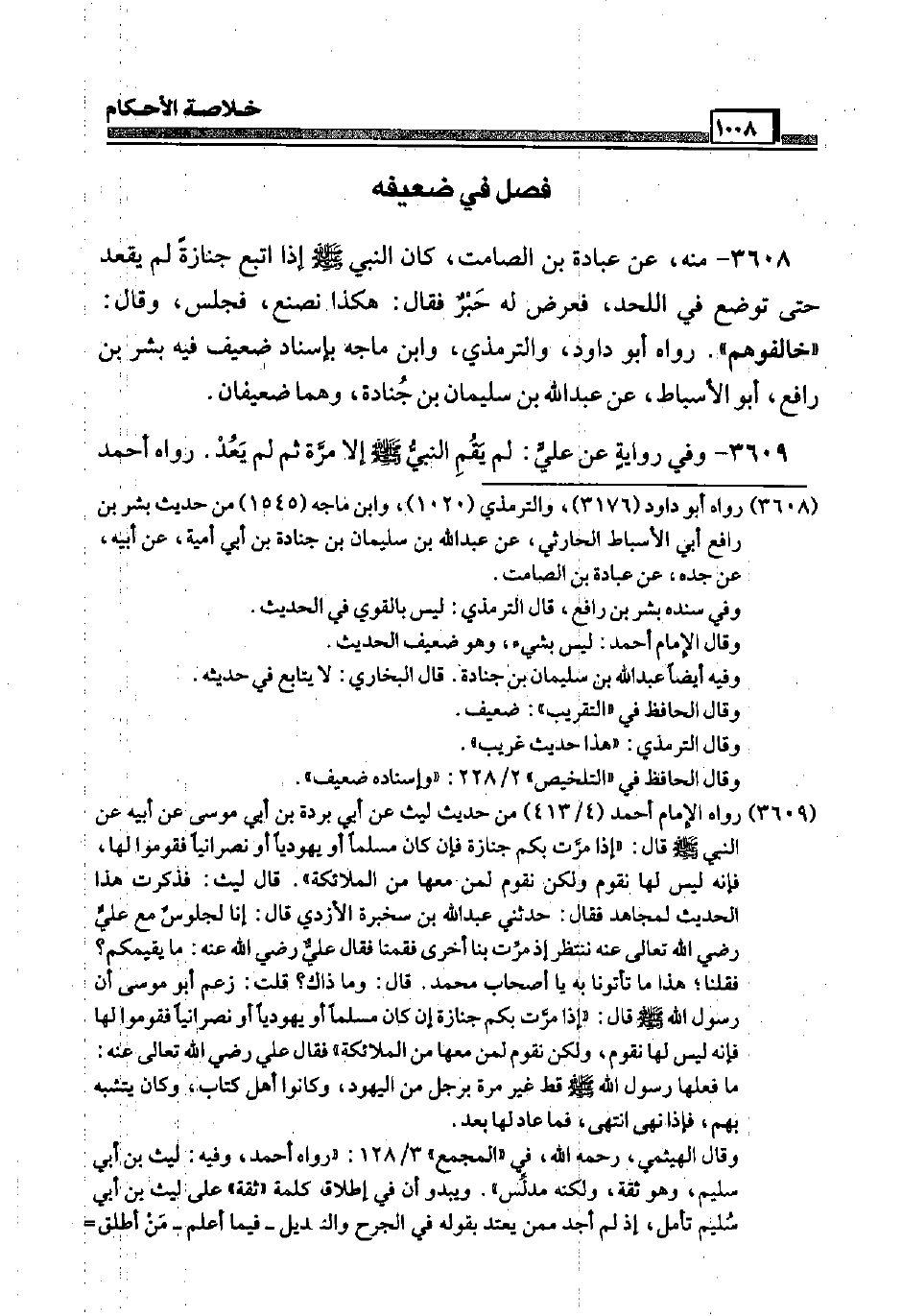 3608 - مِنْهُ، عَن عبَادَة بن الصَّامِت، كَانَ النَّبِي صَلَّى اللَّهُ عَلَيْهِ وَسَلَّم َ إِذا اتبع جَنَازَة لم يقْعد حَتَّى تُوضَع فِي اللَّحْد، فَعرض لَهُ حبر فَقَالَ: هَكَذَا نصْنَع، فَجَلَسَ، وَقَالَ: " خالفوهم ". رَوَاهُ أَبُو دَاوُد، وَالتِّرْمِذِيّ، وَابْن ماجة بِإِسْنَاد ضَعِيف فِيهِ بشر بن رَافع، أَبُو الأسباط، عَن عبد الله بن سُلَيْمَان بن جُنَادَة، وهما ضعيفان.
