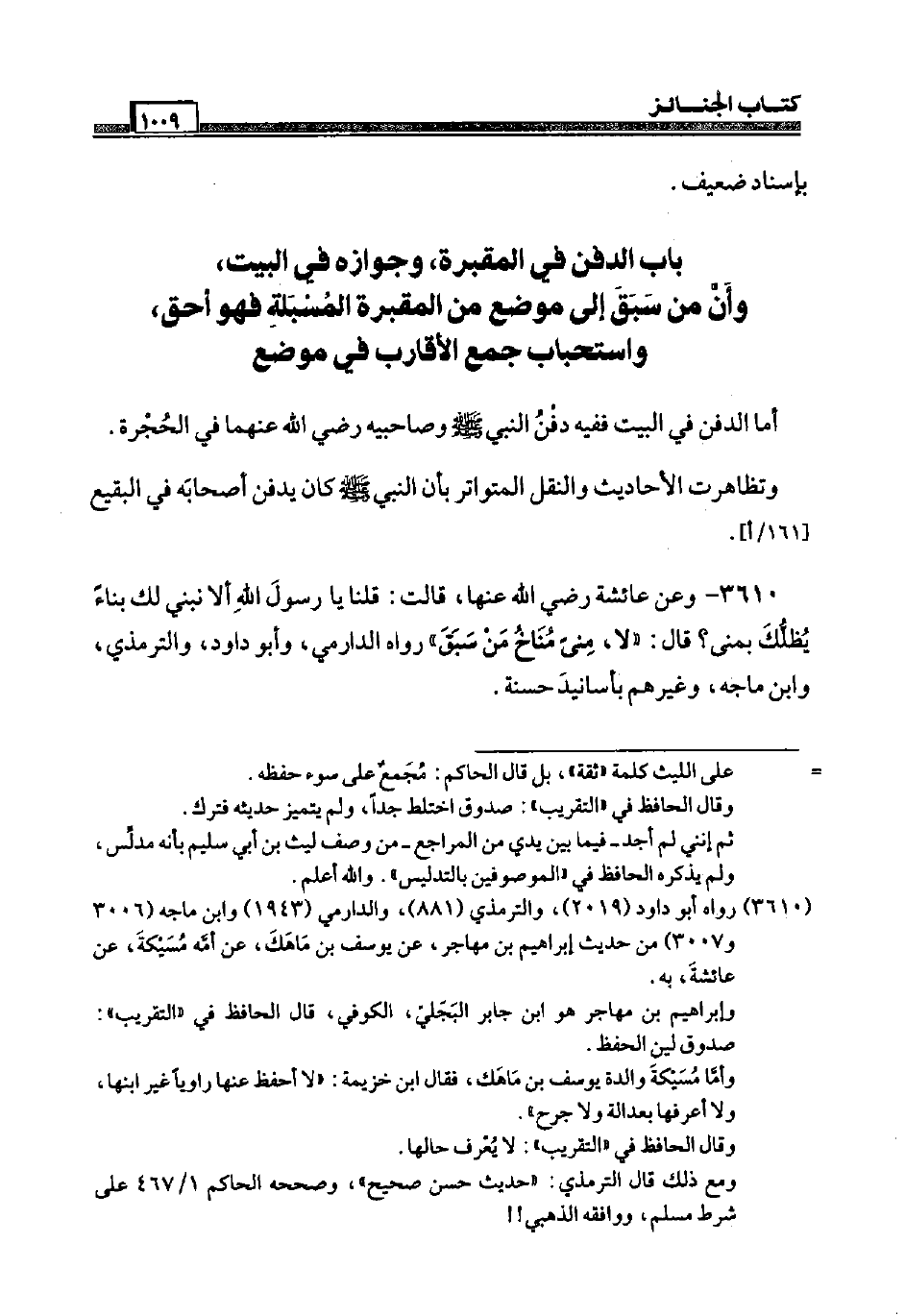 أما الدّفن فِي الْبَيْت فَفِيهِ دفن النَّبِي صَلَّى اللَّهُ عَلَيْهِ وَسَلَّم َ وصاحبيه رَضِيَ اللَّهُ عَنْهما فِي الْحُجْرَة. وتظاهرت الْأَحَادِيث وَالنَّقْل الْمُتَوَاتر بِأَن النَّبِي صَلَّى اللَّهُ عَلَيْهِ وَسَلَّم َ كَانَ يدْفن أَصْحَابه فِي البقيع [161 / أ] .